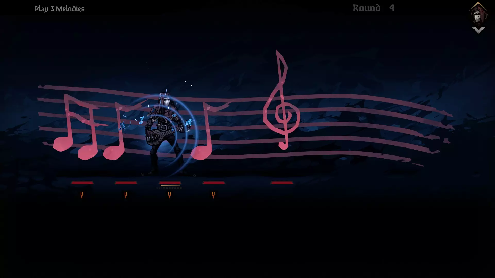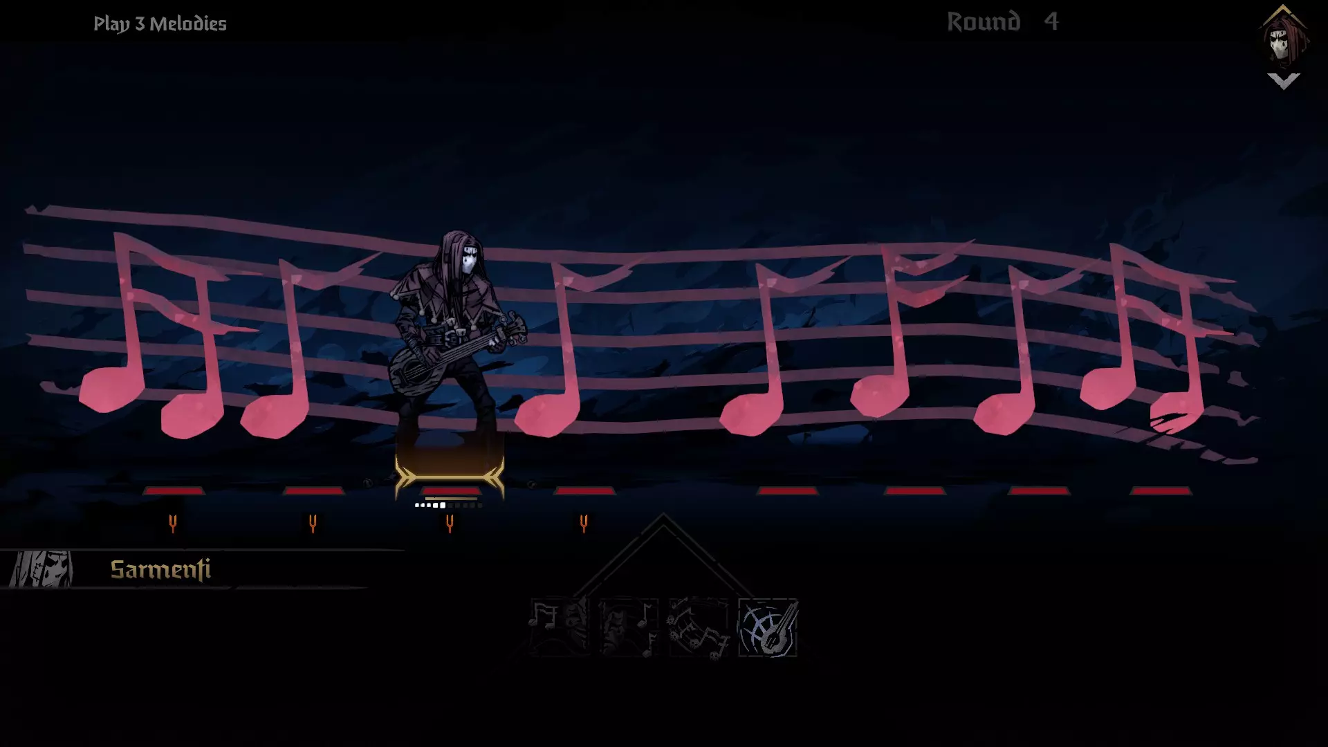 如果音符位置正确,但其中一个音符不同,可以用随机音符替换,这会使你受到2点压力伤害。当所有相同的音符都处于正确位置时,你可以演奏旋律。这不仅会“消除”敌方音符,还会恢复你的压力值。