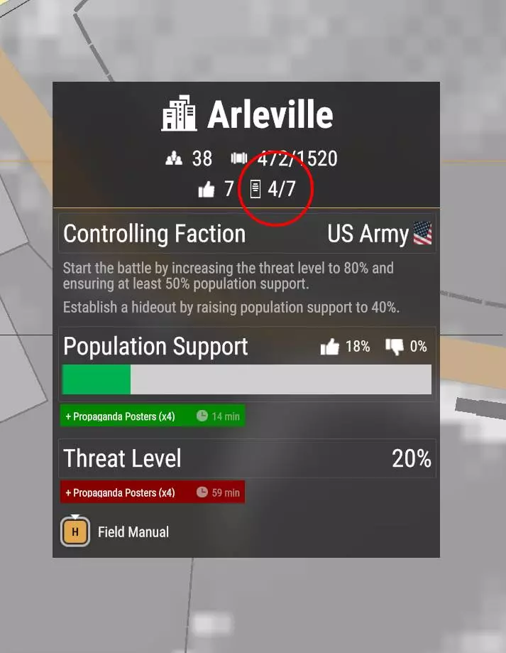 心灵与思想 记住:你在这个模组中的最终目标是彻底解放这座岛屿。要取得胜利,你必须占领埃弗龙岛上的每一个城镇和村庄。但你无法独自完成这一目标——你需要平民的支持。 监控支持:要查看当前忠诚度,只需将鼠标悬停在地图上的定居点上。你将看到当地支持度和当前威胁等级的详细情况。 争取民心:游戏初期获得忠诚度最简单且最容易实现的方法是张贴宣传海报。对于新加入的叛乱者来说,这是低风险高回报的做法。 占领村庄:要控制一个小村庄,你需要达到至少80%的抵抗组织支持度,同时将威胁等级保持在20%以下。这是一种“无声”的接管方式。占领城镇:大型城镇更难攻克。你需要获得50%的抵抗组织支持,然后必须消灭该区域内的所有敌军,将威胁值推至100%。这将触发一场大规模、高强度的战斗。独自完成这项任务极其困难,不建议尝试! 张贴海报的方法:将海报放入活动槽位(例如5号槽),然后在地图标记的位置进行悬挂。