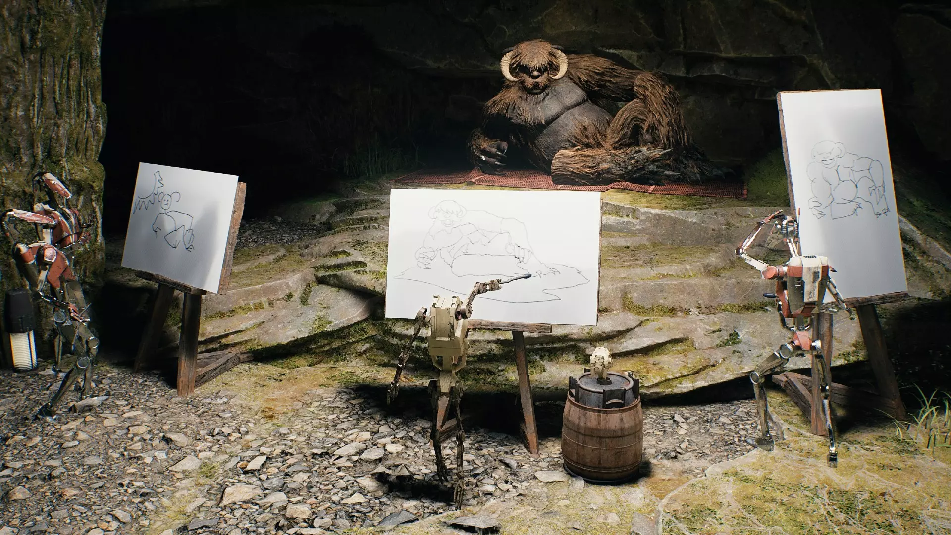 抵达秘密洞穴!洞穴里似乎有战斗机器人在画猴子!