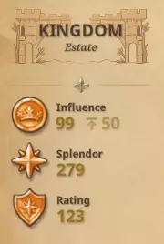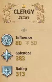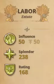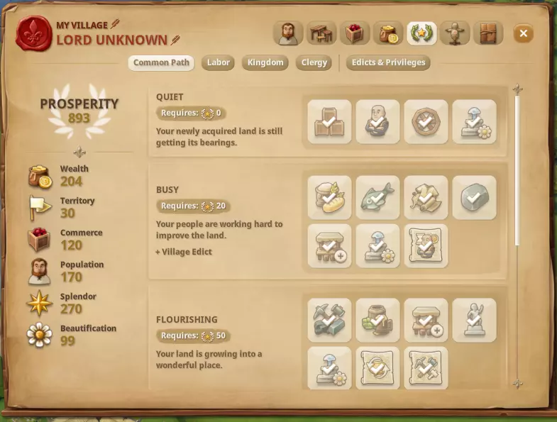 以下是理解繁荣度、影响力、辉煌度和等级之间区别的一些基础知识。在上图中,显示了繁荣度(以花环图标表示),然后是每棵科技树:劳工、王国和神职人员,顶部是当前影响力,下方是等级。 繁荣度会随着游戏的自然进程提升,你可以在通用路径树中查看更多细节,并将鼠标悬停在每个项目上以获取更多信息。要提高繁荣度,你需要增加财富、拥有更多领土、提高人口数量、进行装饰(美化/花朵图标)、通过劳工/王国/神职人员科技树提升辉煌度(星星图标)以及建立贸易路线(商业)。