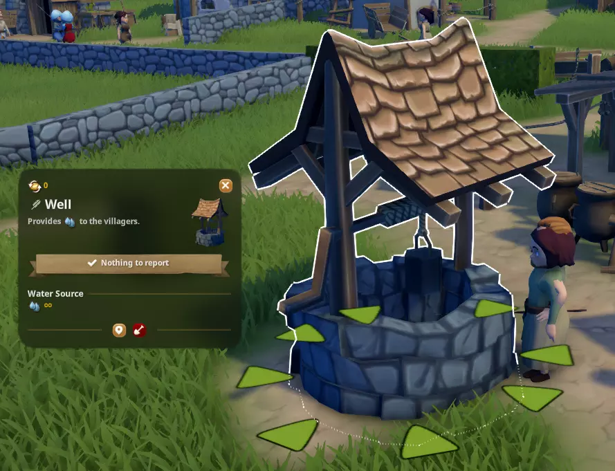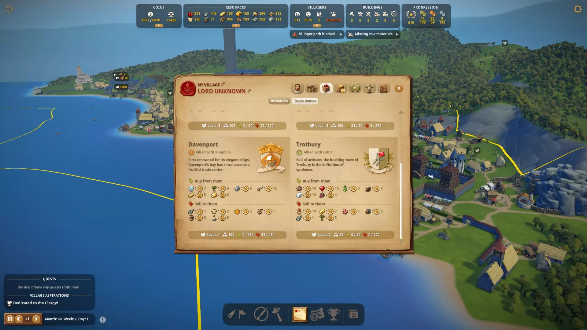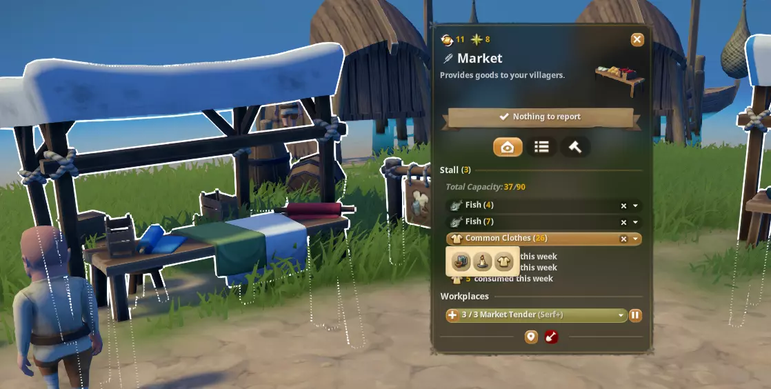 为他们规划舒适的住宅区以建造房屋(军营和宿舍可放置)。这是他们居住的地方,并能获得舒适度(村民住普通房屋,民兵住军营,僧侣和修女住宿舍)。游戏设定中,村民会随着时间推移搬至离工作地点更近的住所,但如果没有空间,他们会在离家数百米远的地方工作,效率低下。有时你可能需要将他们赶出住所,以便他们搬到/建造离工作地点更近的房屋。 注意:如果民兵在加入军队前就已入住普通房屋,他们不会搬到军营。你需要将他们赶出原住所,他们才会搬入军营。解锁商品 从劳工标签中解锁商品市场。 从市场出售商品(衣物、普通用品、蜡烛)。 注意:商品必须存放在仓库中,市场摊主才能获取并进货。 更高地位:当村民需要两种商品时,需两种不同类型的商品,例如不能是购买两次衣物。他们需要能够进入两个出售三种可用商品中不同类型商品的市场。
