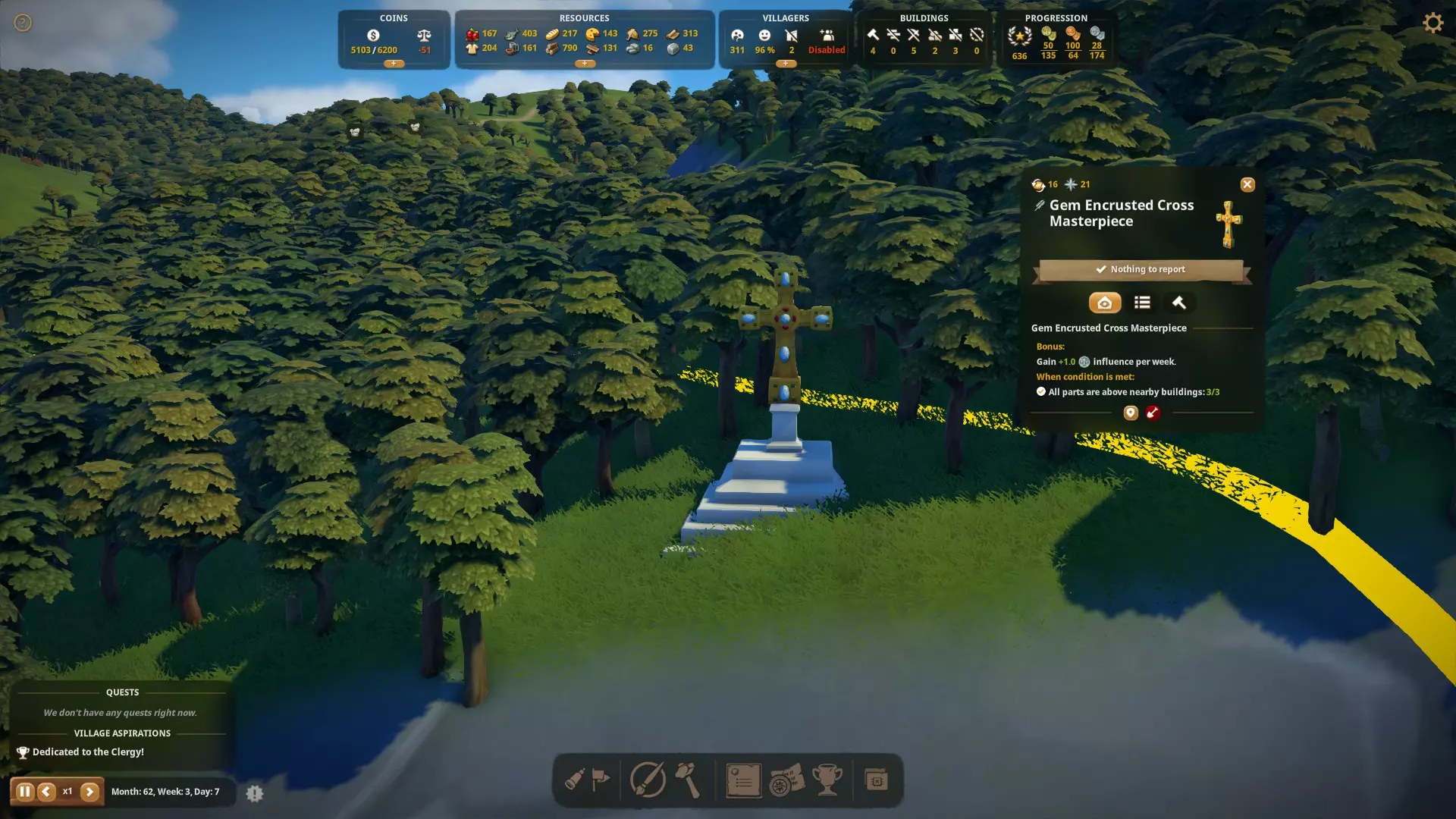 别被误导了!图片中显示了三个蓝图,但实际上通过任务和与你的法警研究可以获得四个。剧透一下,它们分别是:一座雕像、一座行政大楼、两座不同的教堂。 成就 - Masterpieces 接下来的一批成就要求你建造杰作并满足它们的效果条件。在本节中,我将告诉你如何解锁杰作,介绍满足效果条件的方法,以及一些其他可能有用的小技巧。 For Whom the Bell Tolls