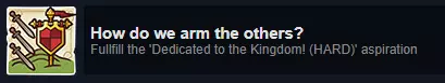 一旦你建造了军事要塞并分配了一些民兵,就可以在进度手册的任务标签中开始派遣他们执行任务。建造要塞后,王国会前来提供一些免费的剑,给你的士兵配备武器是个好主意(不过你想怎么玩都行),你可以在任务标签下的士兵标签中进行操作。拿到剑后,如果你动作快的话,可以立即派遣他们参加一场名为【Proving Ground】的小型训练战斗,与王国军队对抗以获取经验。一旦他们成功完成第一个任务,你就能获得这个成就。更多提示和技巧可在我的指南的军事部分中查看。我们是兄弟连。