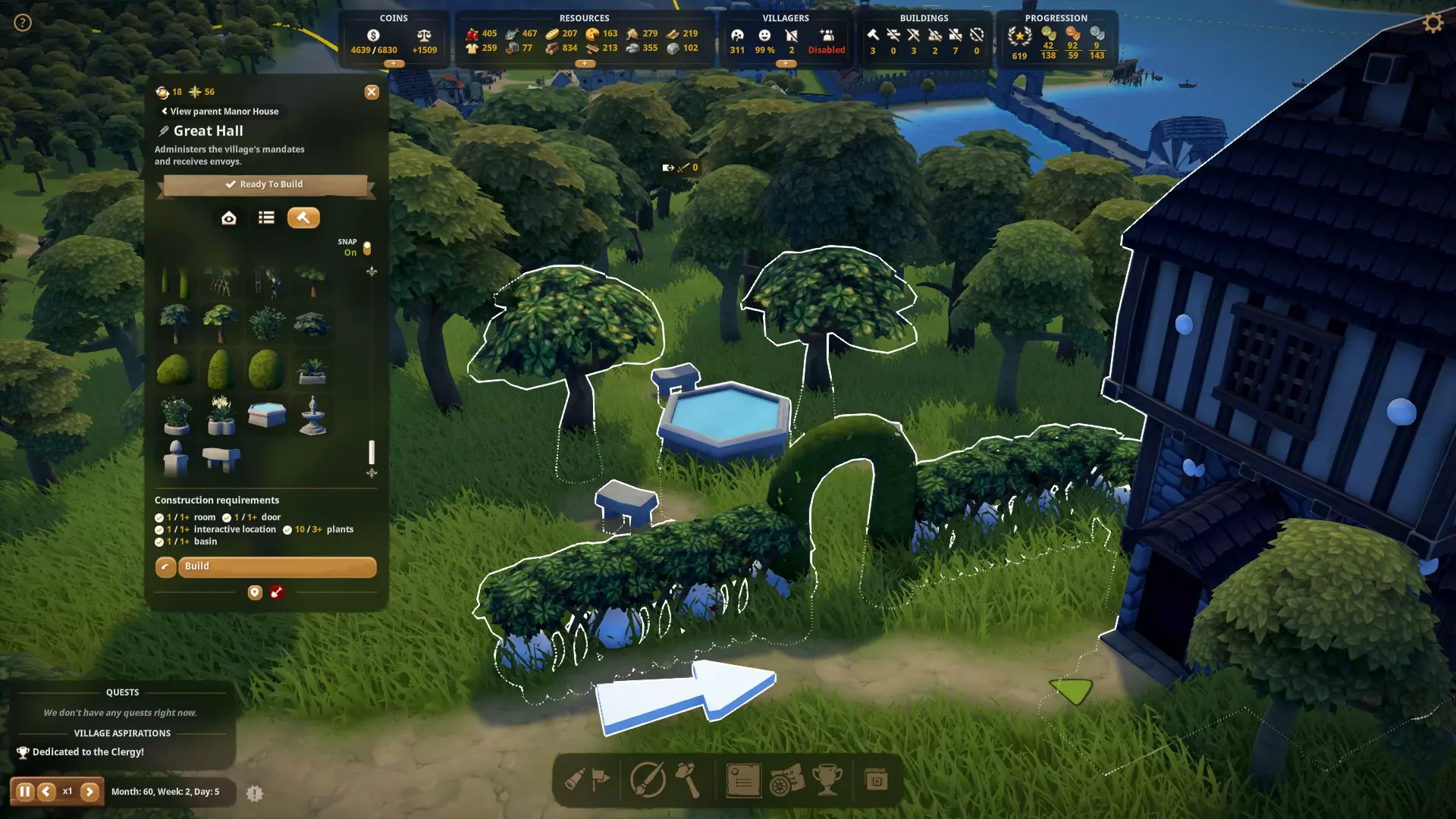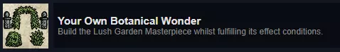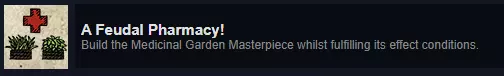 填充效果条件:这些条件会为每个杰作随机生成,有时可能不太适合你的地图,如果你遇到不理想的条件,只能说运气不佳。 所有部分靠近河边:如果你在没有水源的丘陵地图上,这个条件就很糟糕。你需要将其建在靠近水源(河流或海洋)的位置,效果条件会从红色0%变为100%,以此显示你的距离,这需要达到100%。 被森林环绕:你可以将其建在生成的森林中,或者由林场种植的森林里,只需确保条件显示100%环绕即可。 高于所有建筑:希望你有一些丘陵或悬崖。需要将其建在你附近建筑的上方,确保所有部分都高于建筑(条件附近显示绿色)。必须属于包含大厅的建筑:你的庄园主屋、修道院或军事堡垒只能附带一个大厅,因此请选择该建筑并进行编辑。确保你编辑的是大厅(黄色高亮显示),而非其他子功能建筑。 远离其他建筑:顾名思义,当位置正确时,远离建筑物的区域会显示绿色的“接近条件”。 非装饰性部件的最低数量:条件旁的计数器会显示你拥有的数量,如果可以,尝试将其附加到建筑物上,这可能会使用一些部件。不能是装饰品(美化用花卉)。 装饰性部件的最大数量:如花卉或柏树等装饰品 成就 - 愿望 Dedicated to the Labour