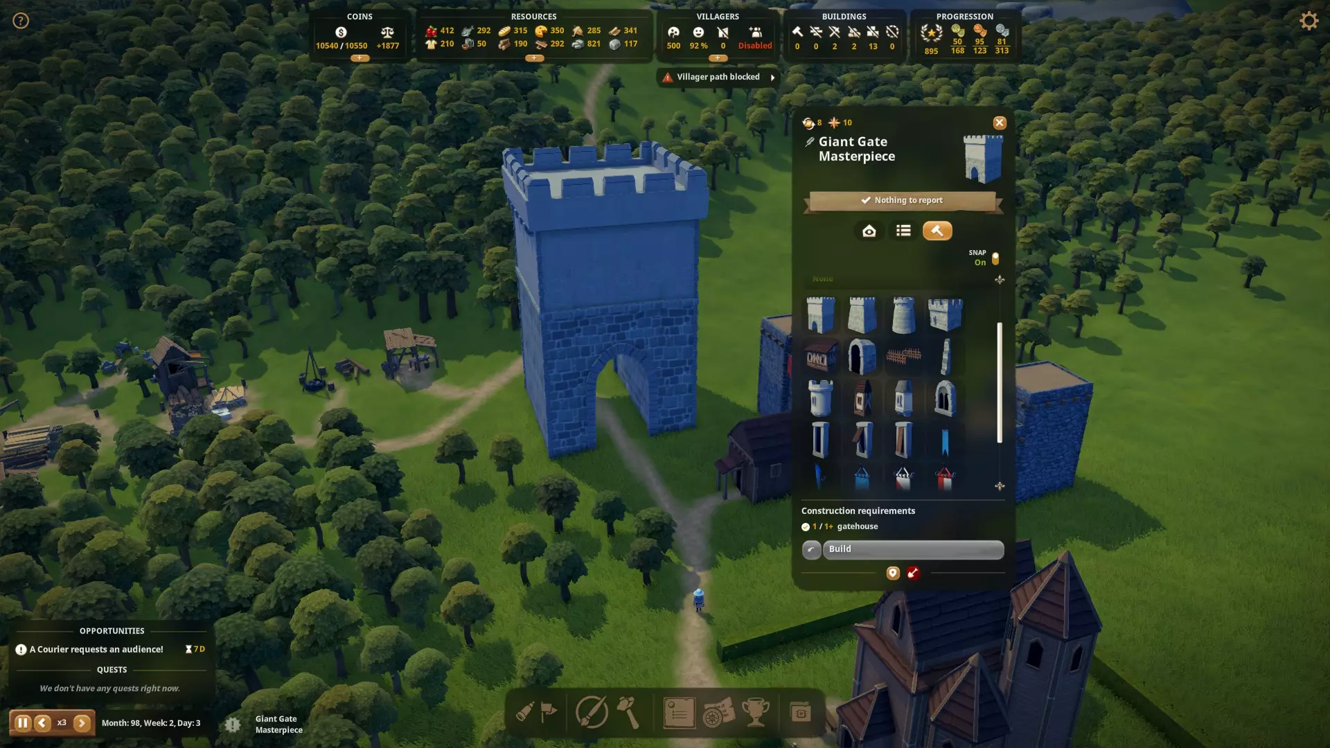 这个成就需要较长时间才能完成,更偏向于游戏后期成就。根据你的游戏风格,你可以选择在地图各处建造小型宝库来美化外观,或者选择建造一两座如下所示的大型建筑,然后静待收益。一旦宝库解锁(第一个:领主宅邸 - 初始解锁;第二个:军事基地 - 达到10点繁荣度时可选择解锁,在王国科技树中与军事堡垒一同解锁;第三个:宗教建筑 - 达到30点繁荣度和5点宗教声望/辉煌值时可在宗教科技树中选择解锁),你就可以在建造这些建筑时将宝库选为子功能,无论是单独建造还是通过编辑现有建筑添加。在建造或编辑建筑时,你可以拖动建筑使其变高,这也会增加以绿色突出显示的金库上限。ZKE3PER提示:如你所见,我图省事直接用了修道院建筑,因为它一开始就拥有最高的上限,然后拖动它来提高上限。根据你拥有的石头和抛光石数量,你可以选择两种不同的建筑,一种只使用石头但上限较小,另一种使用抛光石且拥有最高上限。使用较大的建筑,你只需3-4个就能将金库提升到10,000,之后利润就会填满它。