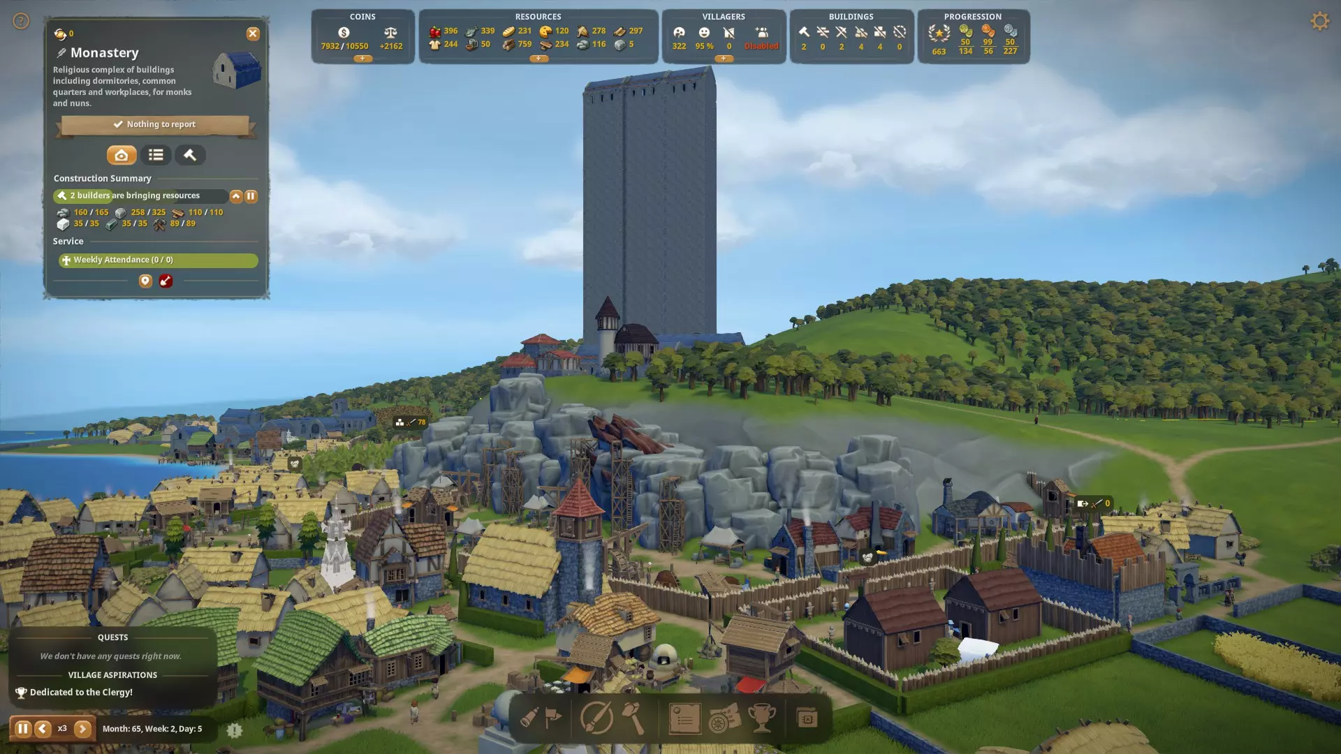建造修道院教堂,且永远不要晋升村民。这意味着你只能拥有农奴、民兵和见习僧侣。 我已经在一局游戏中完成了除两个劳工类和神职人员(困难)之外的所有愿望。这三个可以在第二张地图中完成,方法是共同发展,从不出售任何商品(只需向村民征收大量税款),并且从不晋升任何人。准备好后创建一个存档。 第一局游戏:建造修道院教堂,你将获得两个神职人员愿望。注意:建造教堂需要大理石,所以建议尽快寻找矿场。
