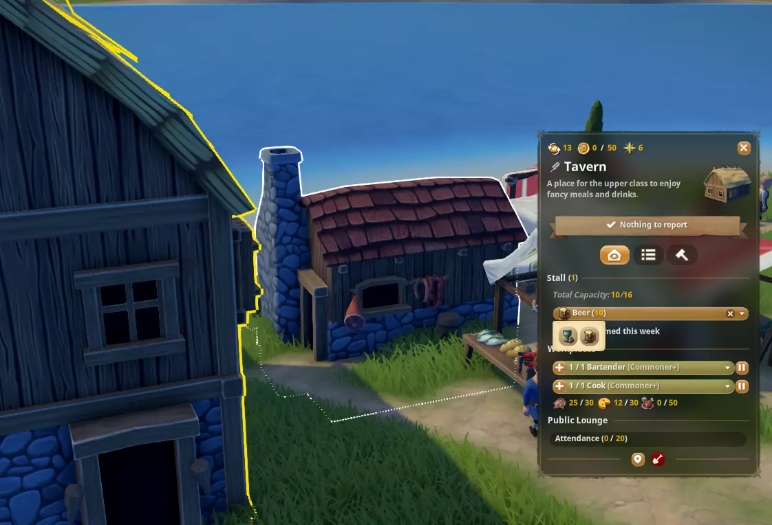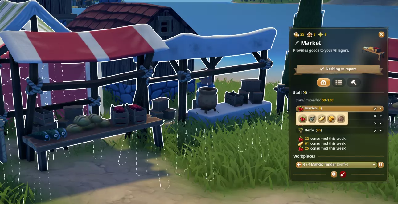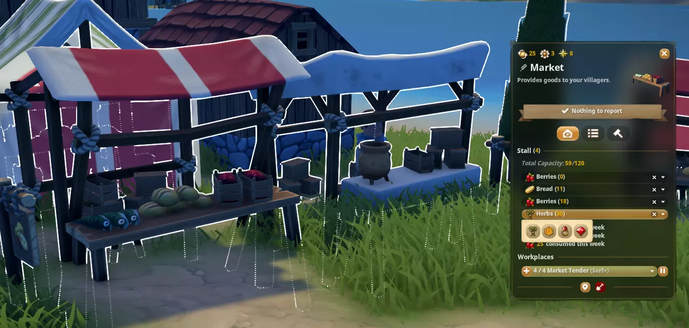 解锁奢侈品摊位:从劳动力选项卡中解锁奢侈品摊位。 销售奢侈品:在市场出售奢侈品(草药、蜂蜜、宝石、珠宝、啤酒和葡萄酒)。 注意:奢侈品必须存放在仓库(宝石和珠宝)或谷仓(草药、蜂蜜、啤酒和葡萄酒)中,市场摊主或酒馆才能获取并上架销售。 更高地位需求:村民需要两种不同类型的奢侈品,例如不能是购买两次草药,而应是两种不同种类的奢侈品。 销售奢侈品的几种方式:
