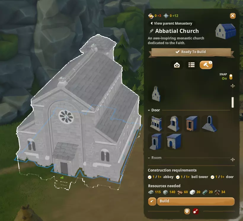 入口朝内,对面的入口朝外——这样可以防止他们被困在建筑内。 它不必与其他修道院建筑相连,但必须是带宿舍的修道院的改造版本,这样分配到该建筑的修士/修女才能拥有回廊。 这是最小尺寸的回廊,你可以根据需要将其扩大。 有两种回廊可供解锁:乡村式和朴素式。它们看起来相似,乡村式回廊带有木质装饰,使用石材和较少的抛光石;而朴素式回廊则使用大量抛光石,并且如果石匠速度慢的话,建造时间也会更长。上图中的是乡村式回廊。雕塑工坊 当你需要开始制作雕塑时,会发现它既不是独立建筑,也不属于石匠工坊(这很奇怪!)。实际上,它是通过编辑建筑工小屋获得的,需要建筑工来操作,而且他们的速度非常慢。首先,你需要通过通用科技树解锁它,然后才能编辑建筑工小屋,将其放置在附近或与建筑工小屋拼接。 当建筑工在雕塑工坊制作这些缓慢又费力的雕塑时(你可以拥有多个雕塑工坊),他们会先制作一个,运到建筑地点进行建造,然后再开始制作下一个。一座杰作需要15个雕塑才能建成,所以要做好准备。