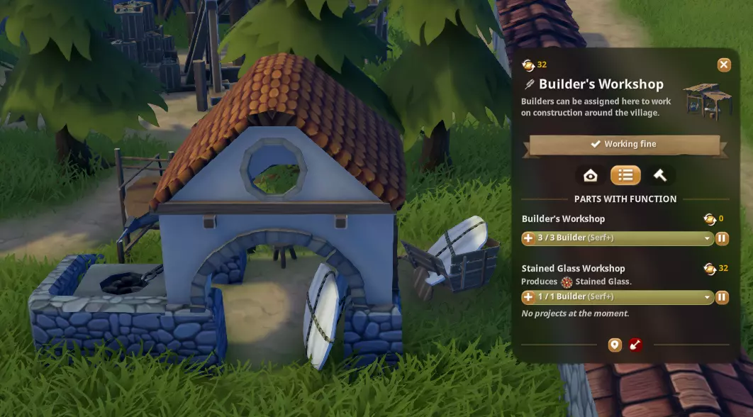 彩色玻璃工坊和雕塑工坊一样,它的位置可能和你想的不一样——它并不依附于玻璃熔炉,而是由建筑工人小屋改造而来(这确实有点让人困惑)。不过这栋建筑看起来相当可爱。它需要消耗玻璃和工具。因此,根据你的游戏玩法,你可以建造一座玻璃熔炉,并雇佣一名市民用石英来制作玻璃(希望你已经找到了石英矿,因为石英是无法购买的)。或者,你也可以直接购买玻璃并存入仓库,之后工人们会从仓库取玻璃并送到工坊。