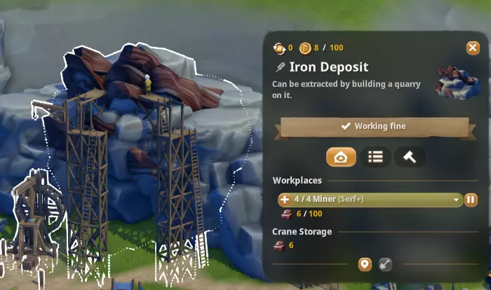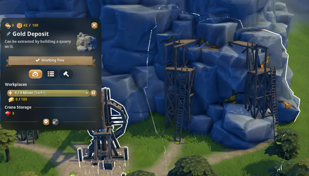 一旦完成勘探,你可以选择购买该区域进行开采,或者继续寻找其他区域。拥有土地后,你可以在上面建造采石场。点击矿场并选择编辑即可进行建造。实用提示:确保开启吸附功能,否则采石场无法吸附到小白点上,你可能会因此气得退出游戏。 每个采石场可以雇佣两名村民,最多建造两个采石场,总共可容纳四名员工。要建造和运营采石场,你必须至少拥有一个仓库和一个采石场,其余建筑则用于提升美观度和效率。建议建造一个小型村庄,包括住房、水井、食品市场和教堂,这样矿工在工作和休息时间就无需长途奔波。我喜欢建造这些【石料场】,因为它们看起来很酷,但一个【矿场】可以有5名矿工,而【石料场】只能有4名,而且矿场的占地面积要小得多。