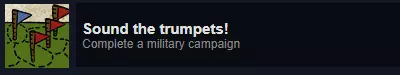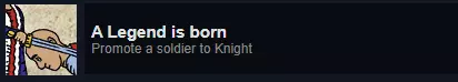 解锁条件:通过指令标签将6名士兵晋升为骑士。此成就较为耗时,因为需要从民兵晋升为士兵,再从士兵晋升为骑士,且每个等级都必须达到最高等级才能升级——民兵(4级)、士兵(10级),此外每晋升1名骑士还需要配备5名士兵。这是我达成的最后一个成就,难度很大。 达成条件后纪念碑的奖励:无