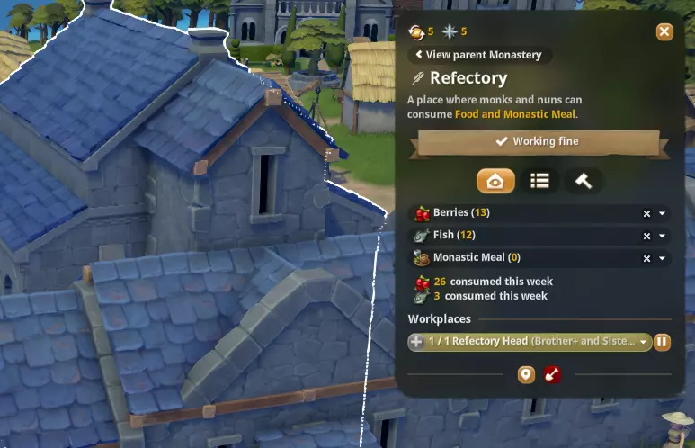 修道院厨房 在神职人员标签中解锁 从修道院厨房享用修道院餐食(草药和水)可获得额外幸福感 需要解锁并建造食堂和修道院厨房,且需要修士或修女同时操作食堂和厨房。
