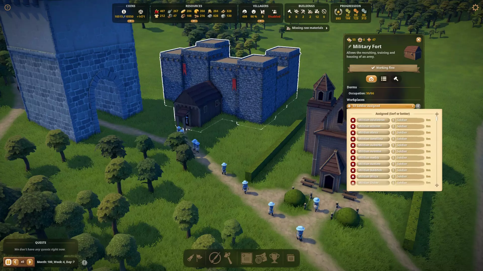 石英 如果你想自己熔炼玻璃而不是购买,就需要开采石英。 军事与王国 在初期阶段,劳工、王国和神职人员的好感度等级是相近的,但当你开始更多地为其中一方或另一方效力时,要保持它们的平衡会变得更加困难,直到你解锁额外特权并在法令标签中进行分配。保持它们相对平衡是可能的,但速度较慢,基本上如果你提升了劳工的好感度,就稍微为王国做些事,然后再为神职人员做些事,依此类推。 当你的繁荣度达到10时,可以用金币购买军事堡垒,这会为你提供强化要塞、兵营、训练场和宝库。开始时,你只需建造一座兵营。建造王国时,会有访客前来,为你的第一批民兵提供一些影响力硬币和剑。兵营一旦建成,就会弹出名为【Proving Grounds】的任务,这是你完成该任务的唯一机会。 我通常会在此处暂停游戏,以避免任务过期。在士兵标签下,为所有新招募的士兵配备剑(我喜欢一开始招募6到12名民兵,稍后会解释原因),然后切换到任务标签,为【Proving Grounds】战役准备部队。这个过程快速简单,能让士兵在接下来的一系列战役前获得增益。当士兵获胜时,左下角会弹出提示,显示他们已胜利并正在返回村庄(返回仍需一些时间,期间你可以派遣他们执行下一个任务)。士兵返回村庄后,屏幕中央会弹出带有蜡封的提示,显示任务奖励,这些奖励会进入城镇中心仓库,若已分配运输工,他们会将奖励运往仓库,否则奖励将一直留在城镇中心仓库。之后,你还可以在士兵标签页查看是否有部队受伤。 受伤部队:在任务中,你的部队可能会受伤,有时甚至会阵亡。受伤部队必须在训练场重新训练;训练状态顺序为:未训练/受伤>部分训练>大部分训练>完全训练。部分部队受伤后,有可能解锁一项杰作,该杰作将加快受伤部队的恢复速度。确保训练场与你的兵营连接到同一建筑,否则士兵将无法训练。 任务选择:在任务标签页下,你将随着时间推移获得各种不同等级的任务,这些任务都有不同的奖励。当你的民兵升级为士兵,然后再升级为骑士后,他们的成功率会更高,你将能够派遣更少但实力更强的部队。在任务标签页的右下角会显示该任务的奖励,准备任务部队时还会显示任务的成功率。选择足够数量的(完全训练好的)部队,使成功率达到极高,这样你就不会有任何部队伤亡。武器 初始时你会获得20把剑,而获取剑的唯一途径是通过生产:开采铁矿石>用木材制作煤炭>冶炼铁锭(需要平民)>制作(需要平民)或购买工具>制作剑(需要市民)。这属于游戏后期内容。 从达文波特处购买剑,每把12金币!!!没人有那么多钱买。 或者,你可以通过赢得它们,毕竟人人都喜欢免费的东西。所以派遣你的部队执行任务来获取剑或长矛。有一个简单的任务【北伯里训练】,能轻松获得长矛,长矛比剑强得多。因此我通常会给所有部队配备长矛,然后在米德尔的仓库以每把6金币的价格卖掉多余的剑。