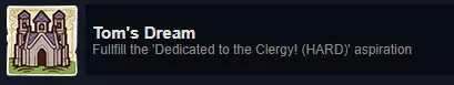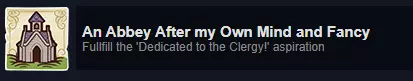 解锁方法:此成就获取简单但耗时。通过指令标签晋升僧侣,晋升消耗手稿而非金钱,且只有修道院的缮写室(通过神职人员科技树解锁的附属功能建筑)中的僧侣会产出手稿。晋升僧侣的流程为:从见习修士/修女晋升为修士/修女,再晋升为院长/女院长。晋升一名院长或女院长需要10名修士或10名修女。 达成条件后纪念碑的奖励:朝圣者会访问圣地,并可能加入你的村庄。 提示:注意此处说的是修士“或”修女,因此你需要10名修士来晋升一名院长,或10名修女来晋升一名女院长。