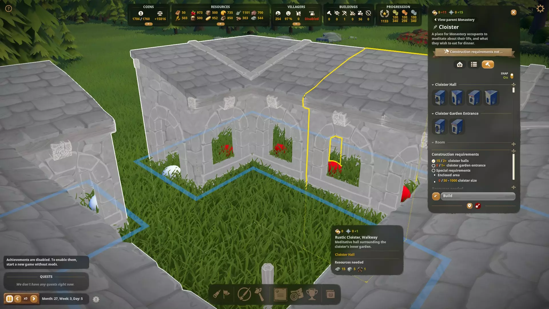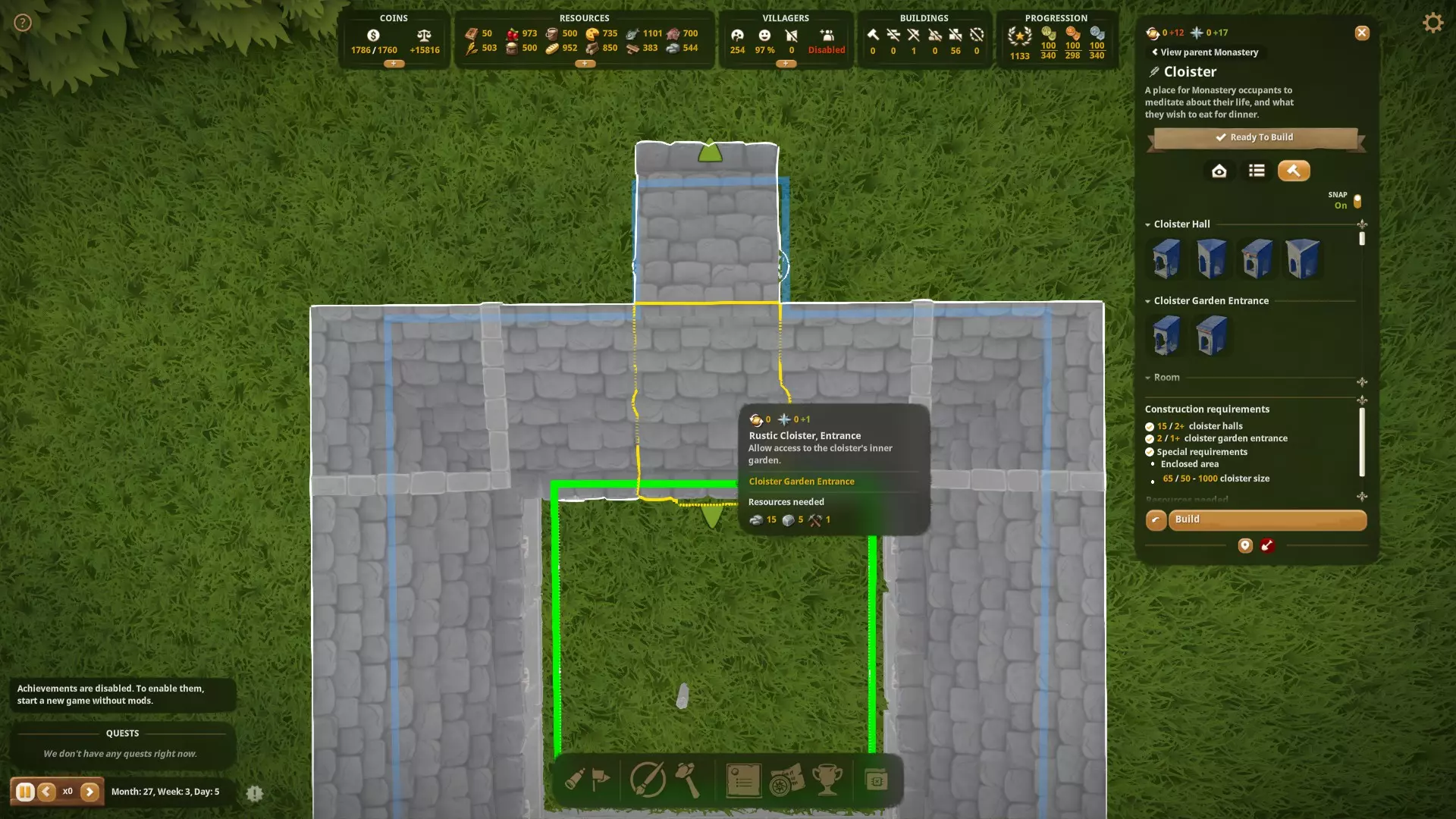 当你游玩新地图时,完成第一个引导任务就能轻松获得该成就。你会从一座乡村教堂开始,只需建造一个房间、钟楼和一扇门,建筑完成后即可满足成就要求。Bad Weather Survivour
