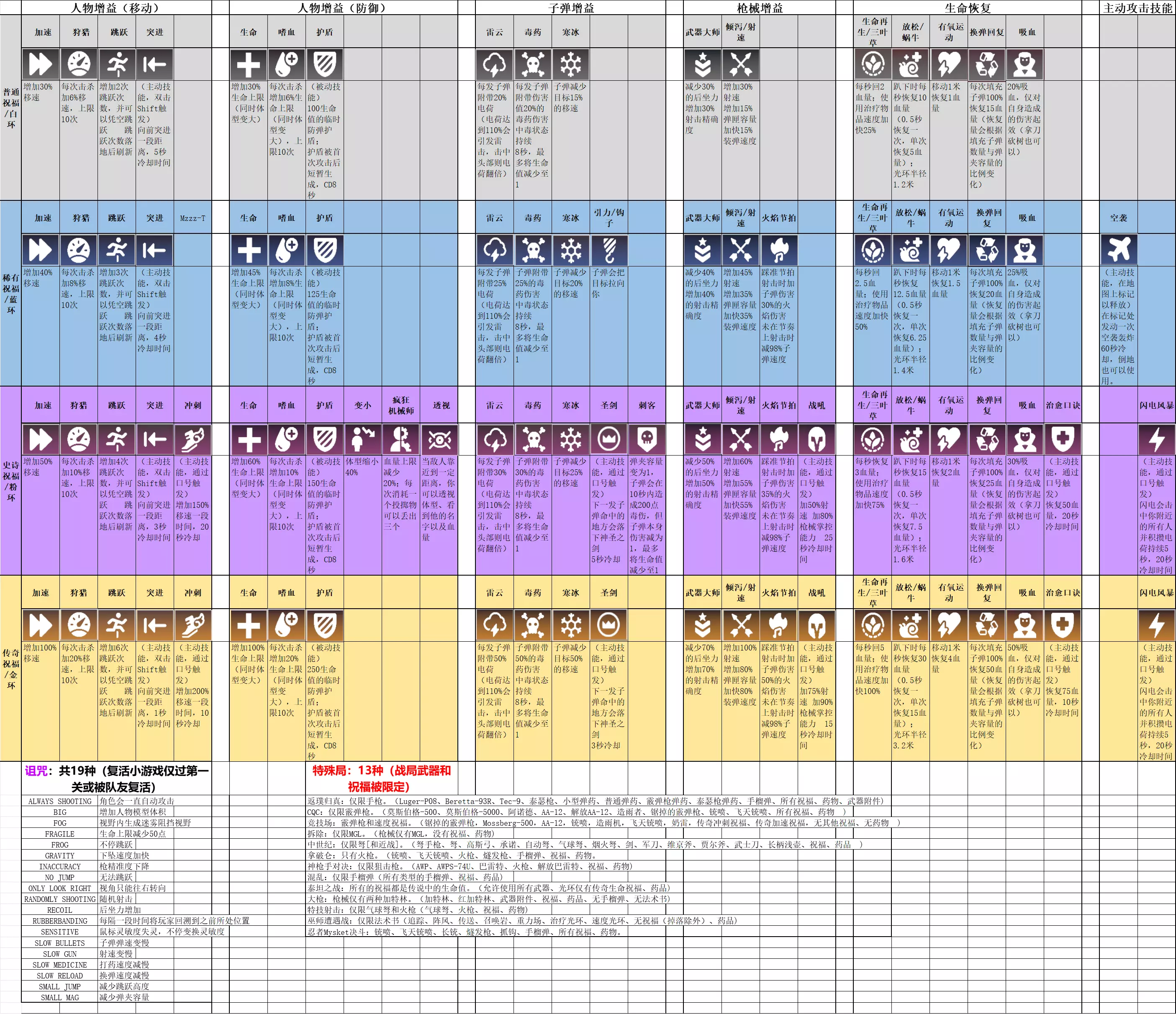 祝福(光环)、诅咒、特殊局如图。诅咒:共19种(复活小游戏仅通过第一关或被队友复活): ALWAYS SHOOTING:角色会一直自动攻击 BIG:增加人物模型体积 FOG:视野内生成迷雾阻挡视野 FRAGILE:生命上限减少50点 FROG:不停跳跃 GRAVITY:下坠速度加快 INACCURACY:枪精准度下降 NO JUMP:无法跳跃 ONLY LOOK RIGHT:视角只能往右转向 RANDOMLY SHOOTING:随机射击 RECOIL:后坐力增加橡皮筋效应:每隔一段时间将玩家回溯到之前所处位置 鼠标灵敏度异常:不停变换鼠标灵敏度 子弹减速:子弹弹速变慢,射击距离短 射速减慢:射速变慢 打药减速:打药速度减慢 换弹减速:换弹速度减慢 跳跃高度降低:减少跳跃高度 弹夹容量减少:减少弹夹容量 特殊局:13种(战局武器和祝福被限定) 返璞归真:仅限手枪基础回归:仅限手枪。(鲁格-P08、伯莱塔-93R、Tec-9、泰瑟枪、小型弹药、普通弹药、霰弹枪弹药、泰瑟枪弹药、手榴弹、所有祝福、药物、武器附件) CQC:仅限霰弹枪。(莫斯伯格-500、莫斯伯格-5000、阿诺德、AA-12、解放AA-12、造雨者、锯掉的霰弹枪、铳喷、飞天铳喷、所有祝福、药物) 竞技场:霰弹枪和速度祝福。(锯掉的霰弹枪,莫斯伯格500,AA-12,铳喷,造雨机,飞天铳喷,奶雷,传奇冲刺祝福、传奇加速祝福,无其他祝福、无药物) 竞技场:霰弹枪和速度祝福。(锯掉的霰弹枪,莫斯伯格500,AA-12,铳喷,造雨机,飞天铳喷,霰弹枪弹,治疗手雷,冲刺祝福,无药物) 拆除:仅限MGL。(枪械仅有MGL,没有祝福、药物) 中世纪:仅限弩[和近战]。(弩手枪、弩、高斯弓、承诺、自动弩、气球弩、烟火弩、剑、军刀、维京斧、贾尔斧、武士刀、长柄浅壶、祝福、药品)(十字弩手枪、十字弩、高斯弩、承诺、自动十字弩、气球十字弩、烟花十字弩、细剑、军刀、维京战斧、领主战斧、武士刀、长柄浅锅、祝福、药物) 拿破仑:只有火枪。(铳喷、飞天铳喷、火枪、燧发枪、手榴弹、祝福、药物) 拿破仑:仅限火枪。(铳喷、飞天铳喷、火枪、燧发枪、手榴弹、祝福、药物) 神枪手对决:仅限狙击枪。(AWP、AWPS-74U、巴雷特、火枪、解放巴雷特、祝福、药物) 神枪手对决:仅限狙击枪。(AWP、AWPS-74U、巴雷特、滑膛枪、解放者巴雷特、祝福、药品) 混乱:仅限手榴弹(所有类型的手榴弹、祝福、药品) 泰坦之战:所有祝福均为传奇生命祝福。(允许使用所有武器、光环仅含传奇生命祝福、药品) 大枪:枪械仅限两种加特林。(加特林、红加特林、武器附件、祝福、药品,无手榴弹、无法术书)(迷你枪、巨型枪、武器配件、祝福、药物,无手榴弹、无法术书) 特技射击:仅限气球弩和火枪(气球弩、火枪、祝福、药物) 巫师遭遇战:仅限法术书(追踪、阵风、传送、召唤岩石、重力场、治疗光环、速度光环,无祝福【掉落除外】、药物) 忍者火枪决斗:铳喷、飞天铳喷、长铳、燧发枪、抓钩、手榴弹、所有祝福、药物忍者滑膛枪对决:(滑膛枪、飞行滑膛枪、滑膛燧发枪、燧发手枪、抓钩、手榴弹、祝福、药品)