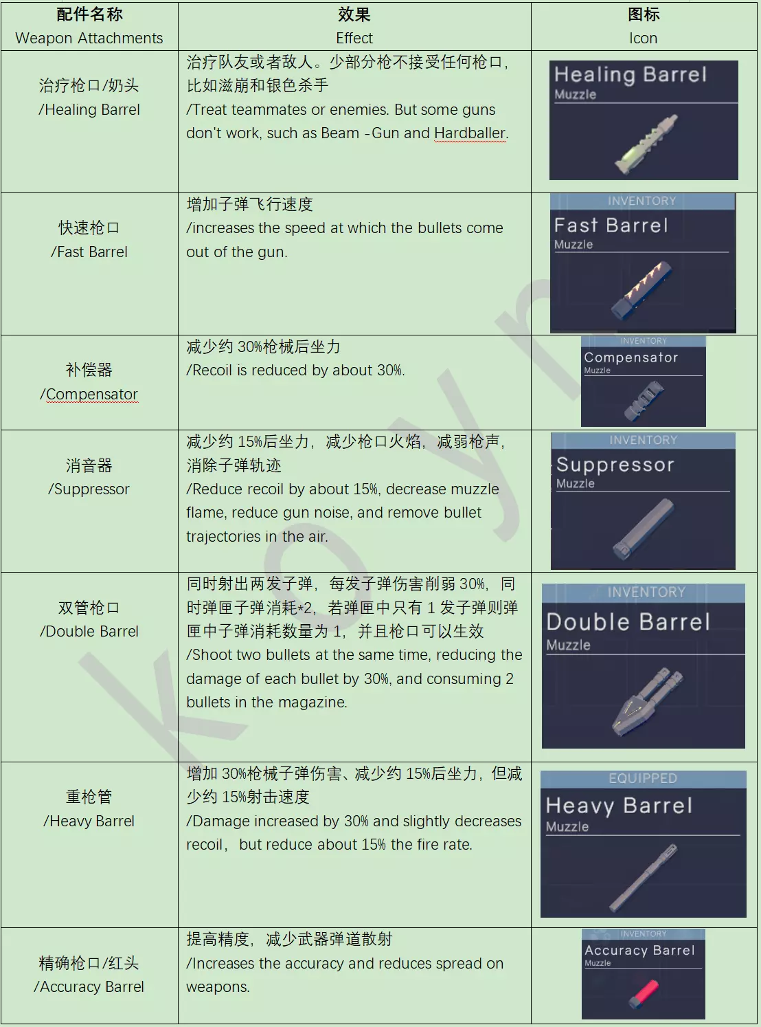 游戏机制(Tips): 1.腰射总感觉打不准的话,可以考虑用steam上的免费屏幕准星工具,名字叫crosshair V2. If you always feel uncertain about your waist shooting, you can consider using the free screen sight tool on Steam, called Crosshair V2. 2.射速光环也能加快魔法书的CD恢复,但射速枪口不行。 The blessing of firing rate can also accelerate the CD recovery of magic books, but the muzzle of the firing rate gun cannot. 3.枪口是否生效,要低头看看枪口是否真的装上,如果显示没有,那么说明这把枪不接受任何枪口。 To check if the muzzle is effective, you need to lower your head to see if the muzzle is actually installed. If it shows no effect, it means that the gun does not accept any muzzle. 4.奶枪口打中别人身上可以增加别人生命值,包括队友和敌人,而不是吸血,国人萌新常见误区。Shooting someone with a muzzle can increase their health, including teammates and enemies, instead of sucking blood, which is a common misconception. 5.大部分回血光环效果可以叠加,除了换弹回血(换弹回收光环只以装备中最高效果的一个为准),以及同品质的蜗牛光环不能叠,不同品质的蜗牛可以叠。 Most health regeneration blessings can be stacked, except for bounce regeneration (bounce regeneration blessings are only based on the highest effect in the equipment), and snail blessings of the same quality cannot be stacked, while snails of different qualities can be stacked. 6.如果你的显示器是4K或者2K,但游戏设置为1080P,有时登陆游戏后会出bug实际显示为4K或2K,需要点击option设置然后点最下面apply就能恢复为1080P。 If your monitor is 4K or 2K, but the game is set to 1080P, sometimes there will be a bug when logging in to the game and the actual display will be 4K or 2K. You need to click on option settings and then click apply at the bottom to restore it to 1080P. 7.只有新手才会躲进红色小房子的顶层阁楼,随便一颗手雷就能送走,尤其是火雷。 Only beginners would hide in the top attic of the red small house, where any hand grenade can be sent away, especially fire grenades. 8.如何识别其他玩家头顶的环强度,每个环下面会有横杠,由弱到强为:一根杠是白环,两根杠是蓝环,三根杠是粉环,四根杠是金环。 How to identify the blessing intensity on other players' heads? There will be horizontal bars under each ring, from weak to strong: one bar is a white ring, two bars are blue rings, three bars are pink rings, and four bars are gold rings. 9.人物体型变大腿变长跑步速度也会快一些,同理用缩小光环也会减慢一些速度。 When the character's body size increases, the legs become longer and the running speed will be faster. Similarly, reducing the halo will also slow down the speed. 10.倒地状态的玩家,被一般的子弹打中只会每颗子弹扣一滴血,被狙击枪打中大概会扣15-20滴,被带healing枪口的子弹打中会回复大量血量。 If you're knocked down, any damage the enemy does to you is 1hp, but the sniper rifle deals about 15-20 damage, so using the healing barrel by teammate is the best option. 11.这游戏没有腰射散布,腰射子弹不会像别的fps游戏那样散开。 This game doesn't have hip fire ballistics spread,and bullets are not like other FPS games to spread. 12.在黑色人型雕像复活一个队友需要一个魂,这个队友被你复活后会附加一个诅咒,每个诅咒需要三个灵魂才能解除,解除地点也在地图上的黑色人型雕像处,灵魂只来自于玩家死亡掉落一个。 To resurrect a teammate need one soul. After you resurrect this teammate, he will attach a curse.Each curse requires 3 souls to be lifted, you need go to the black statue on the map, souls can only come from any dead player (each player can get 1). 13.大斧的技能配合行驶中的车子可以带着车飞行。 You can move quickly by using the special skill of the Jarl Axe weapon on the rear of the vehicle. 14.死亡后的复活小游戏,只通过第一关会复活但赋予随机一个诅咒,通过第二关会正常复活,通过第三关会正常复活并且给予随机一个光环。 This is a resurrection mini-game where, After death, players can revive by passing levels. After passing the first level, players will revive with a random curse; after passing the second level, players will revive normally; and after passing the third level, players will revive normally and receive a random blessing. 15.Taser为泰瑟电击枪,有电击麻痹效果(使敌人倒地抽搐大约1-5秒)。电击系近战武器与盾牌已无电击效果和伤害(它们已被移出正式服)。 Tasers have an electric shock effect (causing enemies to faint and twitch for about 1-5 seconds), and taser-melee weapons and taser-shields no longer have electrocution or damage(And they have already been moved out of regular servers). 16.Liberating为解放系列,每把武器单手持而且全自动,几乎都很强。 Weapons in the Liberating series can be dual-wielding and fully automatic (almost of very powerful). 17.普通子弹各部位伤害:以VSS为例 头部:45,躯干:23,上肢:17,下肢:11,所有霰弹枪和近战武器都没有爆头增伤(除了喷狙)。 The damage caused by bullets to various parts of the human body:VSS:head: 45, torso: 23, upper limbs: 17, lower limbs:11.Almost all shotguns and melee weapons do not add damage to headshots(but only SniperShotgun..? this one). 18.枪类双持时伤害降低为原来的85%,但近战武器双持不会降低。 When dual wielding guns, the damage is reduced to 85% of its original level, but dual wielding melee weapons will not decrease. 19.子弹随距离而降低伤害(最多):突击步枪-20%,霰弹枪-70%除了MS-5000只减25%,弩箭不减伤害,加特林-60%,电击枪不减伤害除了电喷-70%,轻机枪-50%,手枪-40-60%,来福枪98K不减伤害其余减15%-20%,