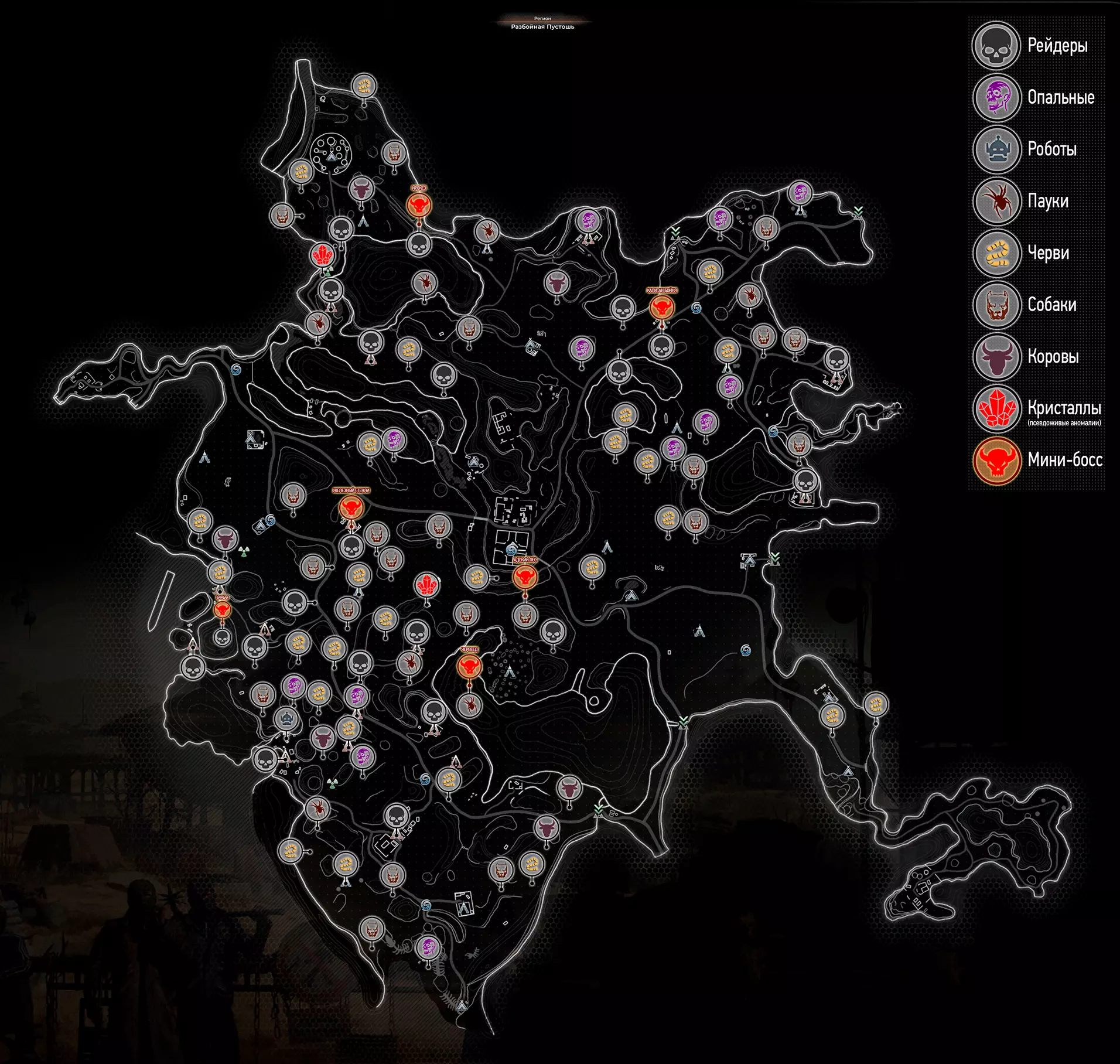 详情。 异常现象:游戏中有“类生物”异常现象——果园、树桩、蜂巢和水晶。也就是说它们可以被“杀死”。果园和树桩属于植物类异常现象,在地图上分布广泛,因此没有必要在地图上标记它们。蜂巢和水晶较为罕见,而且摧毁水晶还能获得经验值!这就引发了一个问题——是否要添加(到地图上)?姑且可以将蜂巢和水晶勉强归为怪物,尽管它们属于异常现象,所以我决定将其作为例外添加进去。 剧情区域和活动中的怪物——部分怪物仅出现在剧情区域或活动中,添加它们没有意义。 地图准确性——根据我的估算,地图准确率为90%。我可能遗漏了某些内容、看漏了、忘记了,或者在编辑时出错却没发现,也可能是有人在我之前经过,杀掉了怪物,然后我过来就什么都找不到了。所以肯定存在错误、不准确和不完善的地方。