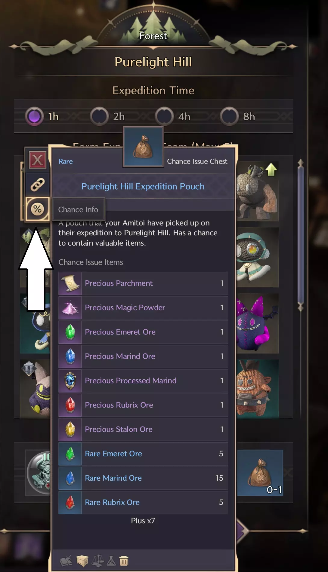 你需要从探险中获取稀有的袋子。获得稀有袋子的概率很低。而且当你获得一个稀有袋子后,从中得到你想要的阿米托伊或变形体的概率也很小。这些信息有点“隐藏”。当你点击某个探险,然后点击袋子时,你会看到常规信息。