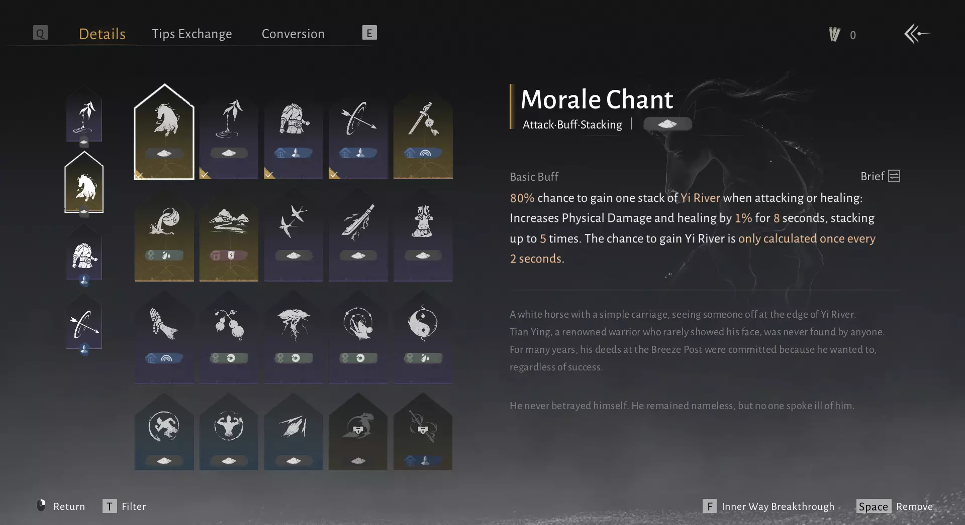 Power of Four 同时装备4种内功心法。 提示: • 内功心法会随着剧情推进自然解锁。 • 你也可以在清河镇和开封城各处找到武学秘籍。 • 只需装备四种即可,无需升级。