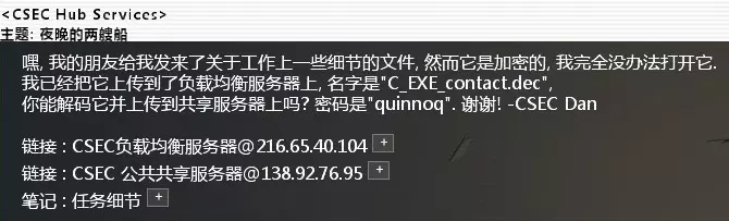 黑入提供的IP,扫描后删除日志,进入新获取的节点【DEC方案小组主页】,接着入侵,在Staff/A.Carey目录下找到Decypher.exe。通过SCP传输完成后删除日志,断开连接。提交任务。 任务完成后CSEC的管理员会发送邮件提供ThemeChanger,下载并运行可获得成就。 CSEC_Contact_#1827. 解开一个加密文件 难度:★★ 邮件名:夜晚的两艘船 相关文件:C_EXE_Contact.dec
