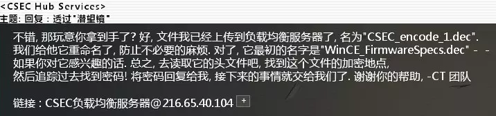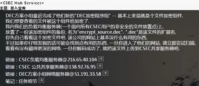 方法一:进入该IP,如果你完成了北极星试炼,可以直接黑入,没有难度,黑入后删除home目录下的文件,完成任务。 方法二:如果你没有完成北极星试炼,可以查看相关帖子下方的回复,找到一个IP。进入那个IP,黑入之后扫描EOS设备,进入EOS设备可以看到主服务器的密码为ithoughtyouweremakingtea。 返回主服务器,账号admin,密码如上,登录后删除home下的文件,完成任务。 完成任务后收到北极星组织的恭喜邮件与进入CSEC的邀请。 Part.2 主线攻略 - CSEC组织 来自CSEC的邀请:完成Entropy组织的几个任务后,CSEC会发来邀请,根据服务器IP一路黑过去,得到密码:ABX07cc9。 卡关的话请尝试使用scan。来自CSEC的邀请 - 批准黑入提供的网址后扫描一下,发现合作主页,黑入,并下载home/training_files目录下的几个文件。之后上传到CSEC共享服务器上,完成任务。 上传指令:upload home/XXX 来自CSEC的邀请 - 恭喜完成以上任务后,就正式加入CSEC了。 得到了CSEC任务库地址和资源服务器地址。 可以在任务库里接任务。卡关的时候可以看看资源服务器的exe是不是漏掉没下。 任务都是可以全做的,完成一定数量的任务后解锁甲虫计划任务。甲虫计划完成后即会收到V的来信,解锁bit的任务线。 CSEC_Contact_#740. 发现或开发解码软件难度:★★★ 邮件名:潜入宝库 相关节点:DEC方案小组 任务奖励:Decypher.exe
