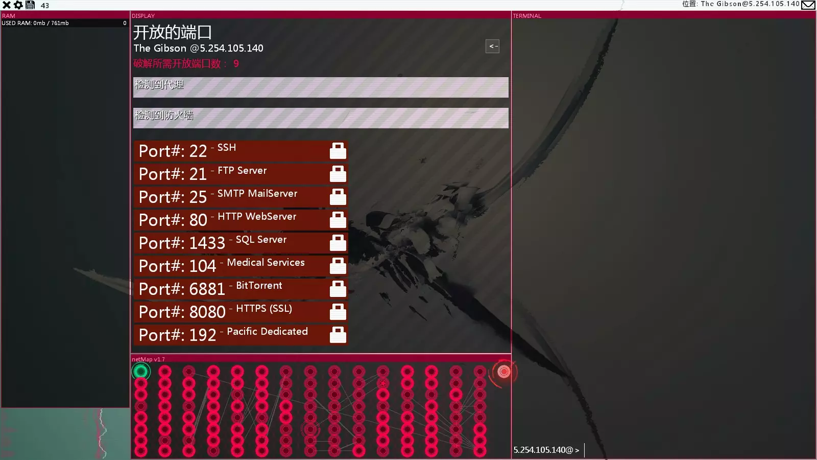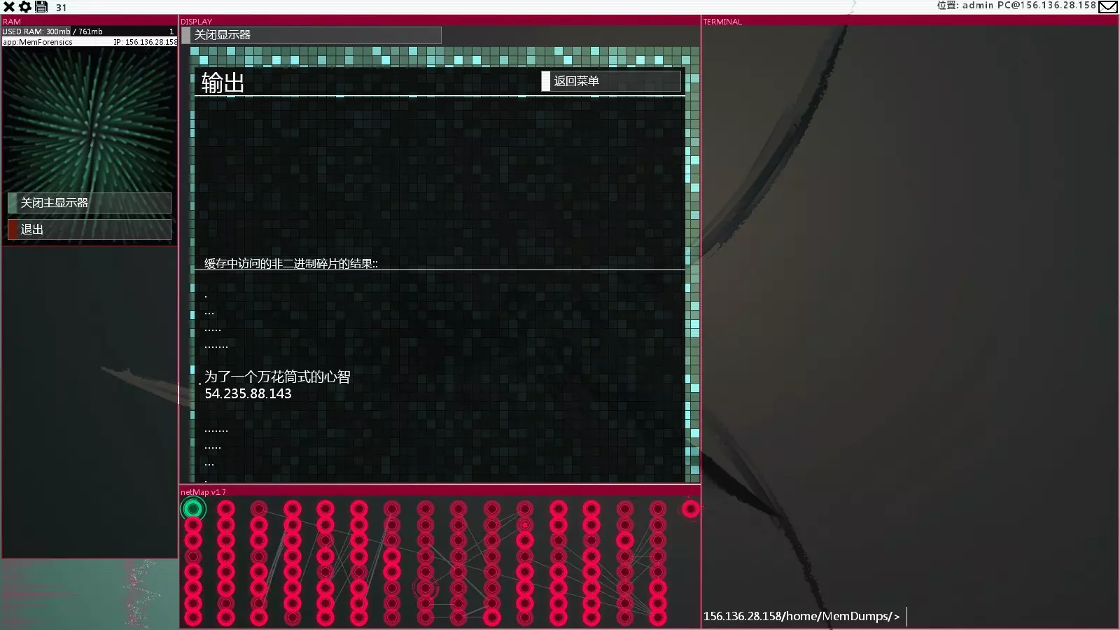 小技巧:破解防火墙时观察,每行剩余的一个大写字母即为正确密码。例如这个防火墙,analyze两次后通过观察,可以得知密码为malice,直接solve malice。完成以上四个训练后,依次将得到的数字进行组合,得到【北极星之首】ip:103.33.8.162。Final. 北极星之首。引用自Ofuda.txt:我们已经注意到你了,马上,你就会加入我们。在home目录下gift文件夹中获得white_x-server.sys以及SQLBufferoverflow.exe,后者可以用来破解SQL端口。与主线中期得到的工具SQL_MemCurrupt完全一致。所以这个工具基本没什么用,错过也没什么影响。不过如果你在进入支线前没有打DLC,那么这个工具还是有用的。下一个任务就可以用到。 额外内容。The Gibson - DLC隐藏内容 通关DLC获得MemDumpGenerator与MemForensics程序后可以找到该节点。 操作方法: 在北极星之首用MemD内存取证,然后获得?????_dump.mem 然后回到本地主机,在home/MemDumps文件夹用Memf内存扫描,选择内存中的进程文件。