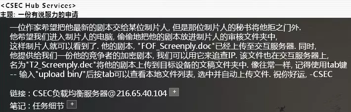 进入CSEC负载均衡服务器,使用scp命令传输FOF_Screenply.doc和DECHead T2_Screenply.dec文件。连接【ip】,黑入该ip后将剧本上传至home/Scripts目录,完成任务。CSEC_Contact_#635。教老狗学新把戏 难度:★★。邮件名:二进制大学(宇宙)。相关节点:国际学术数据库。节点密码:techtonic