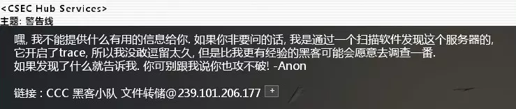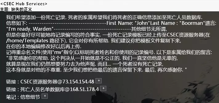 按要求下载好测试文本后: 移动模板文件至Boorman_John[12345] 查看Boorman_John[12345]文件内容 替换[FIRST_NAME]为John 替换[LAST_NAME]为Boorman 替换[RECODE_NUM]为12345 替换[LAST_WORDS]为我准备好了,典狱长 之后把文本上传到死亡人员名单数据库里,提交任务。 CSEC_Contact_#1086. 调查一个可疑的服务器难度:★ 邮件名:警告线 相关节点:CCC黑客小队 节点密码:honeypot