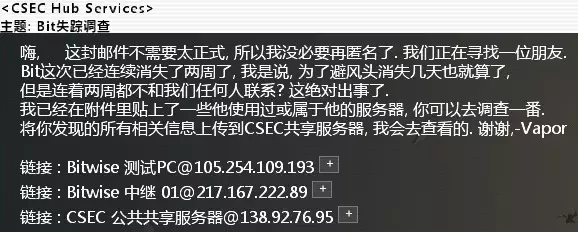 为什么说这个没有难度呢,是因为经过我测试直接提交任务也可以完成该任务。 如果想黑入该服务器,可以用开局Bit要求删除的【SecurityTracer】来完成任务。 正常情况下黑入服务器的难度:★★★★★(如果你没有删除【SecurityTracer】的话就好办了) 详细步骤: 进入【CCC黑客小队】的服务器后,先运行【SecurityTracer】,然后运行【SQL】和【SSH】破解端口,快完成的时候断开连接,然后再进入,会发现这两个端口已经打开了。然后接着运行【SecurityTracer】,接着破解就能进去了。 可以得到【Honey】主题。 【CSEC_Contact_#2369】:调查一位【CSEC】成员的失踪难度:★★★ 邮件名:【Bit】失踪调查