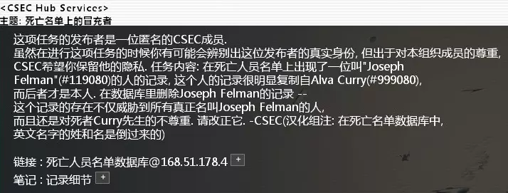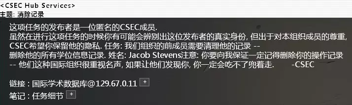黑入国际学术数据库,然后查询“Jacob Stevens”,删除他的学位记录,完成任务。 同上,记得删除日志。 CSEC_Contact_#916. 删除伪造的死亡记录难度:★★ 邮件名:死亡名单上的冒充者 相关节点:死亡人员名单数据库