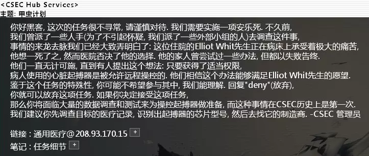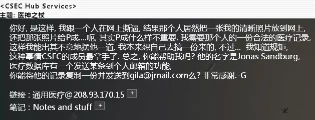 黑入bit中继01服务器,在home/Home_Base.txt里获取bit共享服务器IP。 黑入共享服务器,然后找到READ_ALL_HACKERS.txt并下载。 上传到csec共享服务器上,完成任务。 CSEC_Contact_#438. 调查一份医疗记录 难度:★★ 邮件名:医神之杖 相关节点:通用医疗
