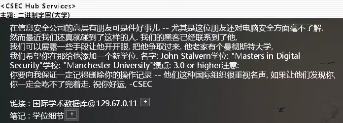 黑入国际学术数据库,查询“John Stalvern”,按要求添加学位记录,完成任务。 保险起见记得删除日志。 CSEC_Contact_#1225. 清理一项学位记录难度:★★ 邮件名:消除记录 相关节点:国际学术数据库 节点密码:techtonic