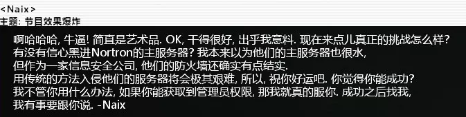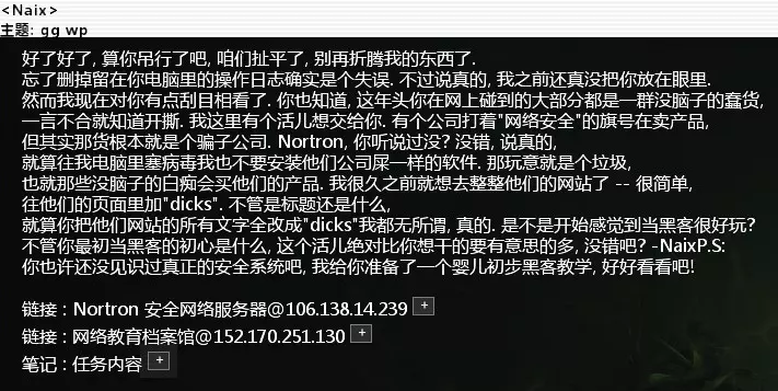 任务内容:要求我们黑入Nortron的安全网络服务器,并在上面添加【dxxk】。 nmap analyze solve nortron WebServerWorm 80 SMTPoverflow 25 PortHack cd web cat index.html replace nortron dxxks(自行补全)任务完成,回复邮件。 3. 入侵Nortron主服务器上一个任务提交后,会收到Naix的来信【节目效果爆炸】