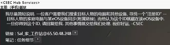 进入CSEC负载均衡服务器,解密此文件。得到源文件IP。(不清楚IP会不会变) 然后打开邮箱,回复给他,完成任务。 CSEC_Contact_#1269. 调查eOS设备难度:★★★ 邮件名:【手机】越狱 相关节点:Sal工作站 附加细节:AAX1BB7