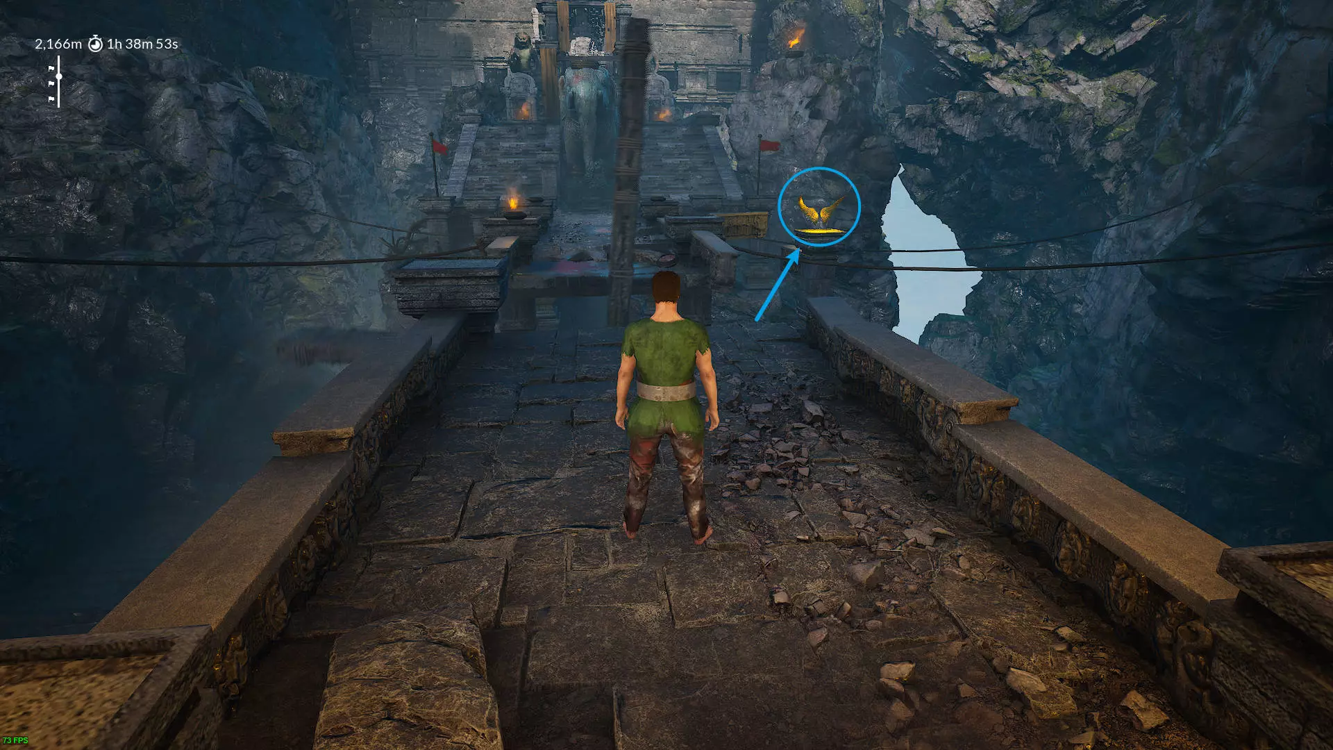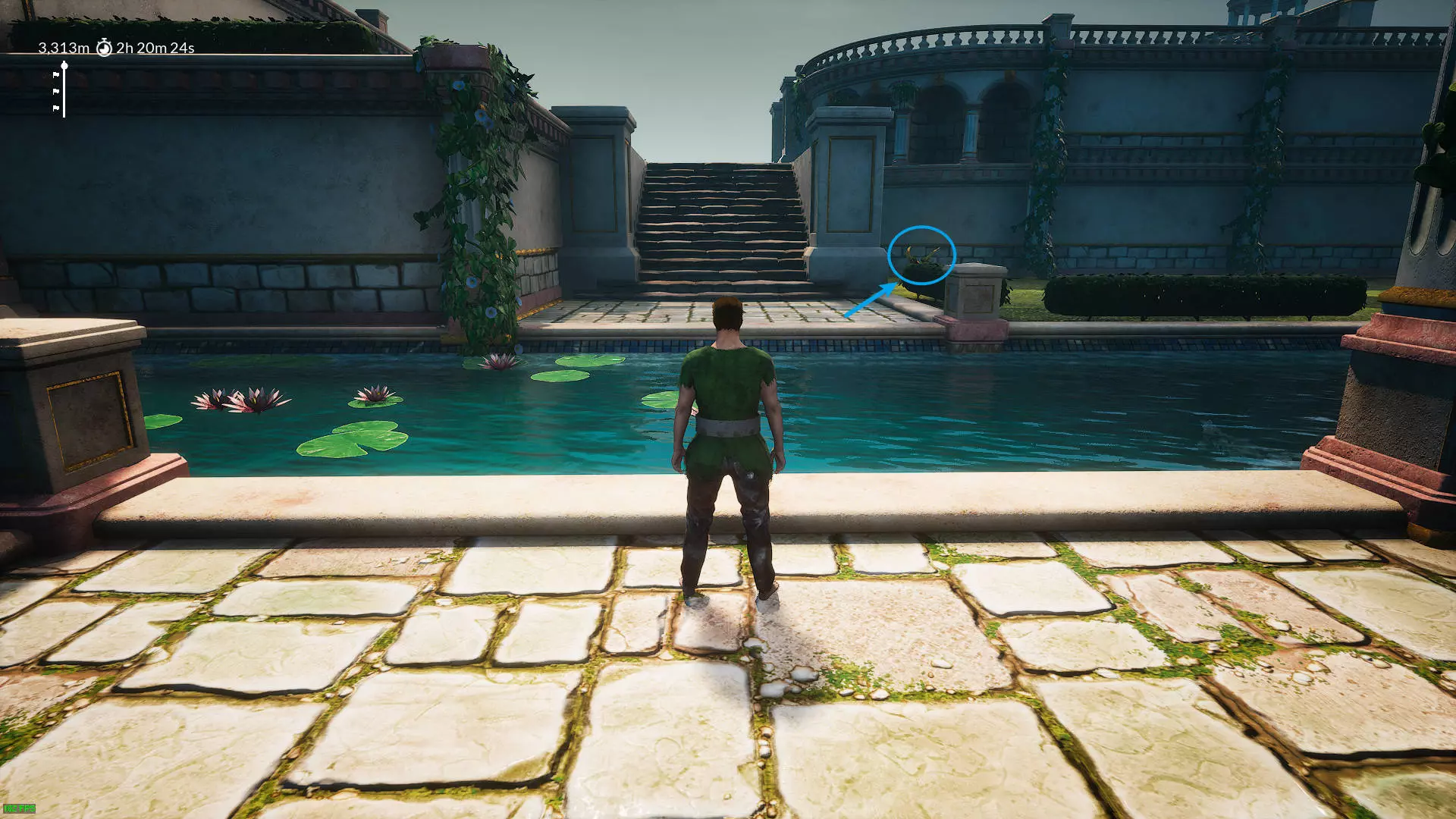 10.3313米 从石柱跳过来之后,过一条河,在必经的楼梯右边。