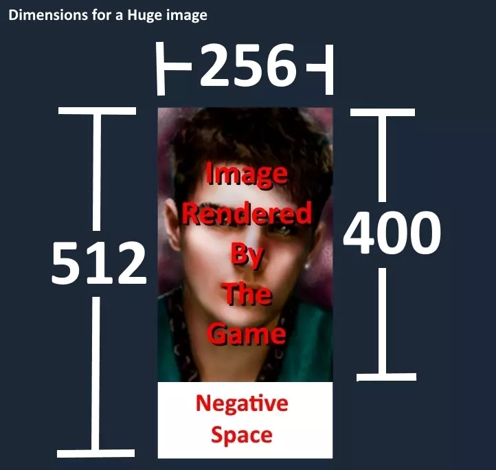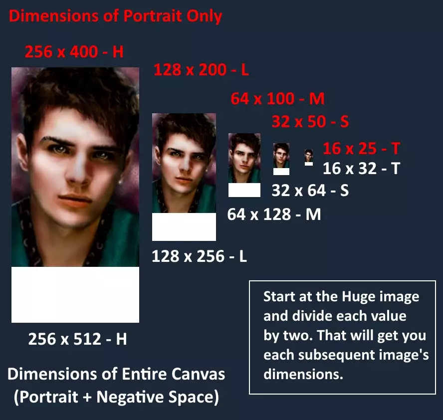 想要更好地控制你的肖像?请继续阅读。 方法二 - 高级转换 此方法虽然更具挑战性,但能让你完全自由地调整肖像的显示效果。例如,你可以在角色面板中使用全身肖像,而右上角的肖像只显示角色的脸部。不过,当你操作几次后,会发现其实非常简单。请仔细注意加粗的说明,不按要求操作很可能导致肖像无法正常显示。 《无冬之夜》每个肖像使用五个文件。上半部分是游戏中显示的图像,下半部分是空白区域。图像尺寸如下,所有列出的尺寸单位均为像素: - 巨大(256x512画布;使用上方256x400区域),见于角色创建界面 - 大型(128x256画布;使用上方128x200区域),见于角色面板 - 中型(64x128画布;使用上方64x100区域),见于生命值条旁的右上角 - 小型(32x64画布;使用上方32x50区域),见于队伍栏(不包括玩家自己的角色)和环形菜单 - 微型(16x32画布;使用上方16x25区域),见于鼠标悬停名称气泡和聊天窗口 每张图像的文件名末尾必须带有对应尺寸的字母。所有文件必须为.tga格式。若为.jpg、.bmp等格式,图像将无法在游戏中渲染。你的头像所有图片必须具有相同的名称,仅末尾的单个字母(H、L、M、S和T)不同。