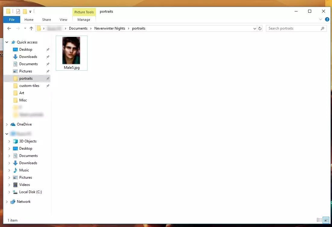 从这里开始,你可以选择两种方法。一种更简单,另一种则能让你完全掌控肖像的外观。 2A. 方法一 - 简易转换 这是添加自定义肖像最简单的方法,无需操心尺寸、.tga文件、留白等问题。使用此方法,游戏会自动将你的肖像缩放到所需的所有尺寸。 1. 将你的256×400像素.jpg文件(例如Male5.jpg)放入《无冬之夜》安装目录下的portraits子文件夹中(通常路径为文档\无冬之夜\portraits)。
