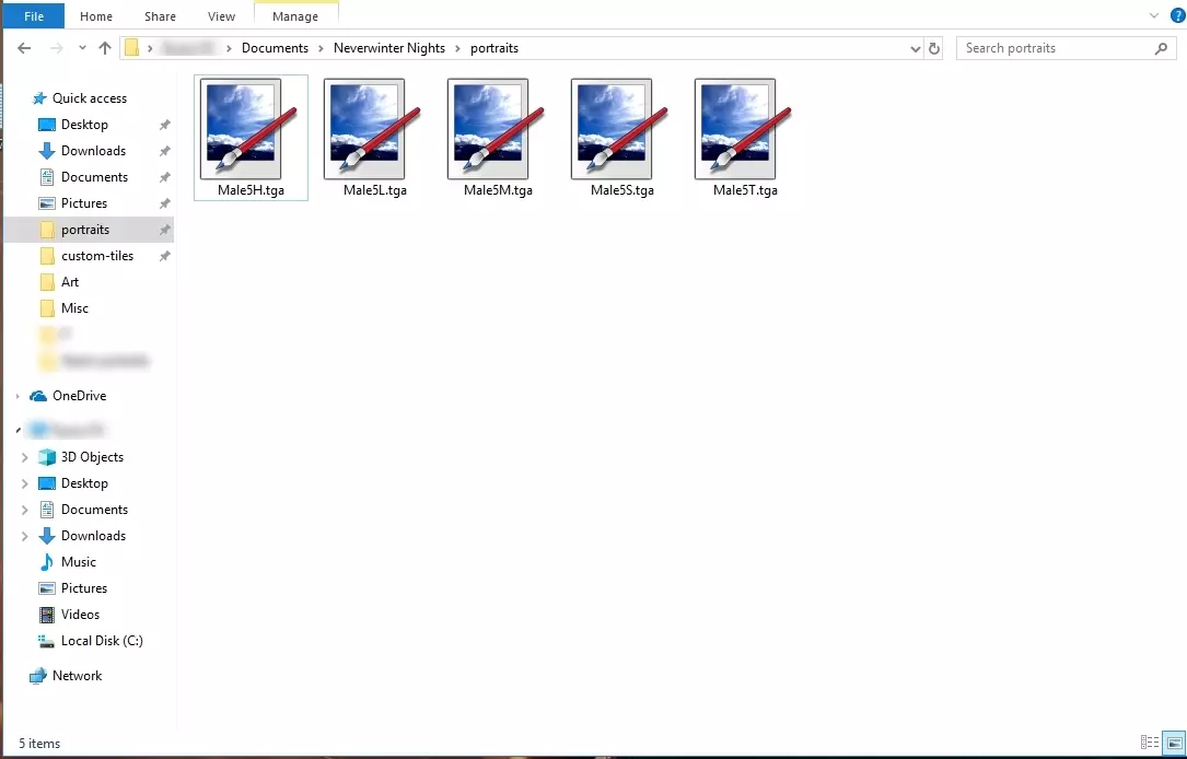 1. 根据上述尺寸制作五张图片,添加负空间并相应调整每张图片的大小。记住每个文件的文件名末尾必须包含其对应的字母。 2. 将.tga文件放入《无冬之夜》安装目录下的portraits子文件夹中(通常路径为文档\无冬之夜\portraits)。