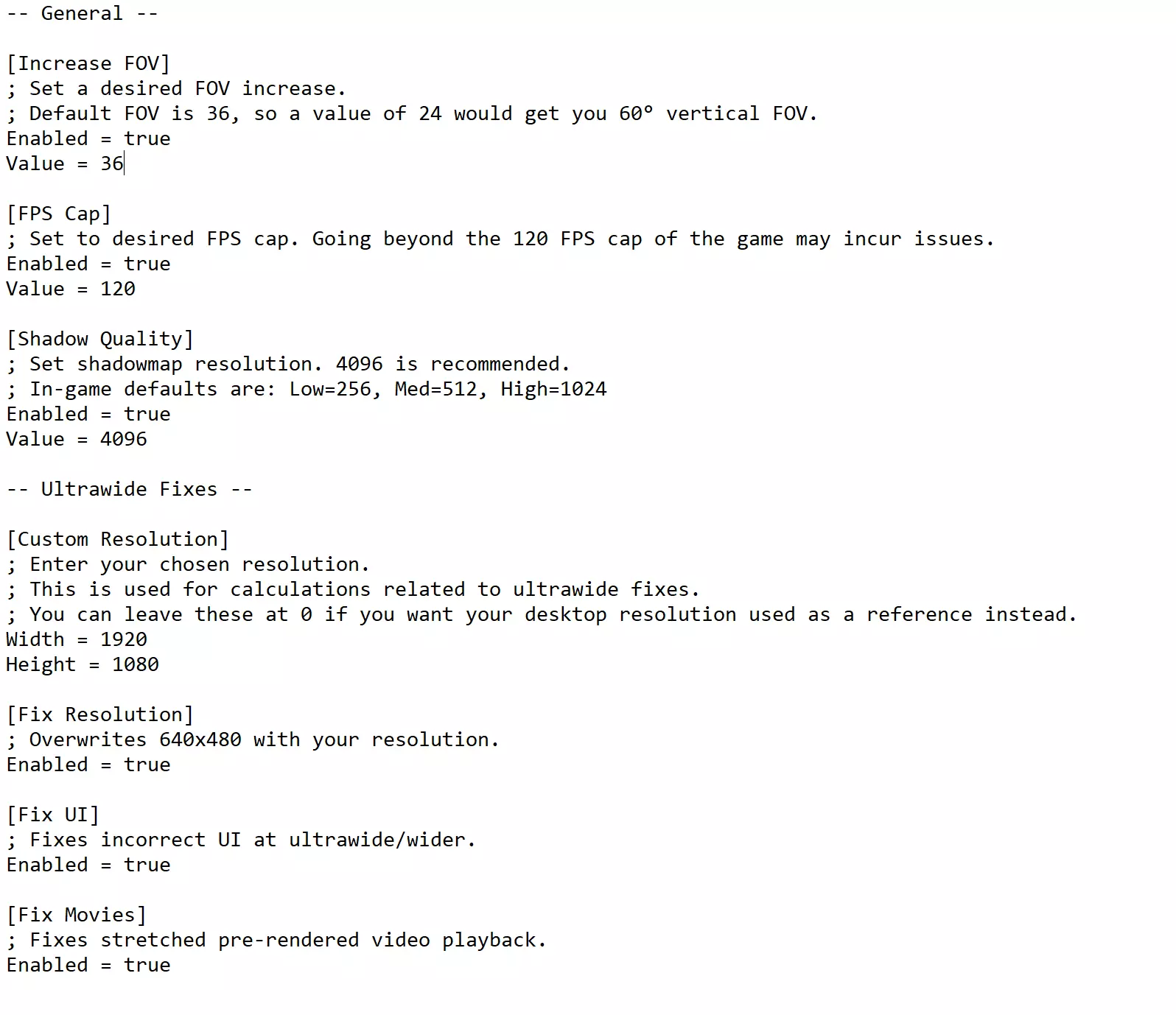 引用自 Lyall:21:9分辨率搭配调整后的视野和高质量阴影。 下载小型压缩文件后,只需将两个文件解压到《生化危机:启示录》的根目录,也就是rerev.exe所在的文件夹。 就是这么简单,修复补丁已经安装完成!现在你可以根据自己的喜好进行调整。 使用任意文本编辑器打开RERevFix.ini,你会看到以下内容: