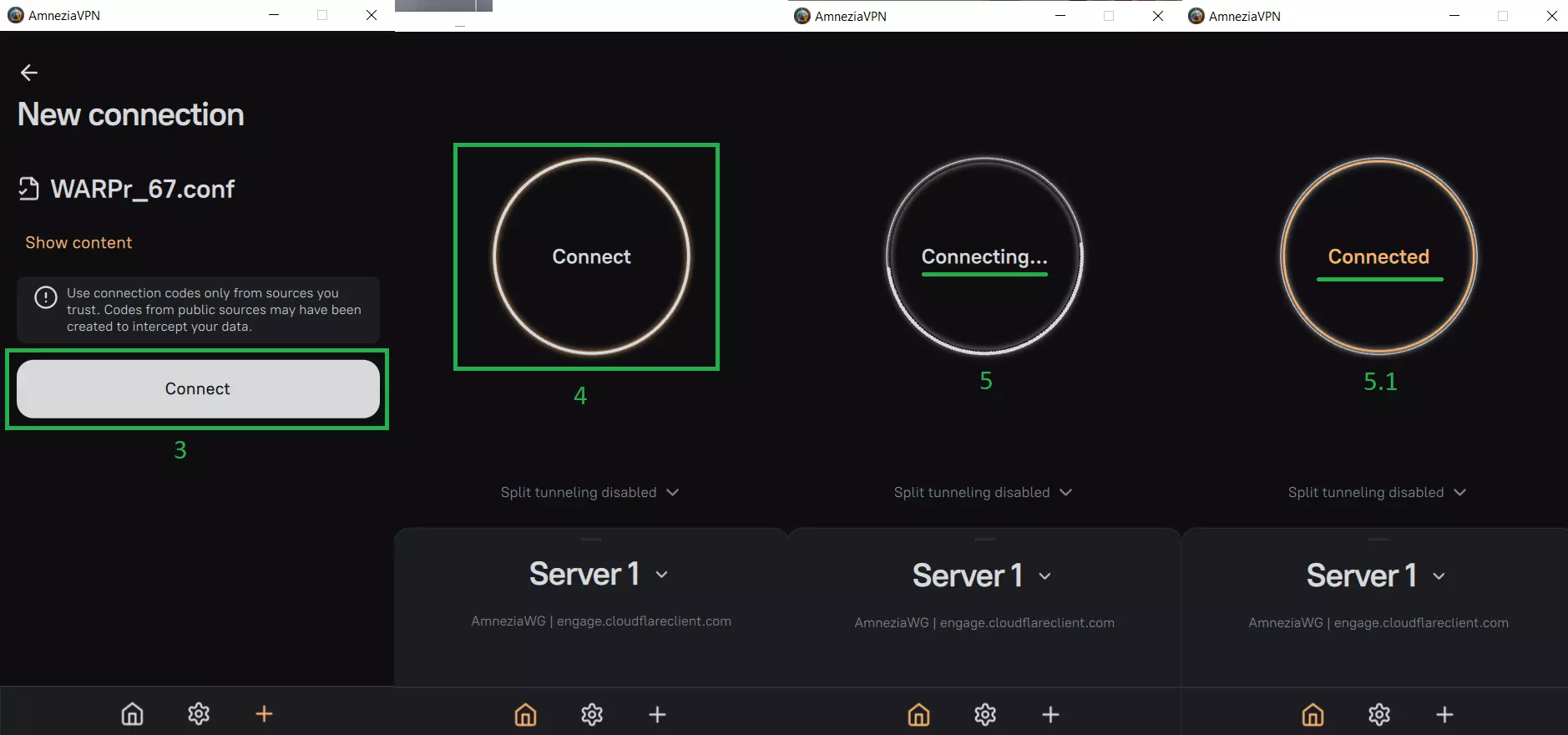 添加配置(3)→ 连接(4)→ 查看连接(5)