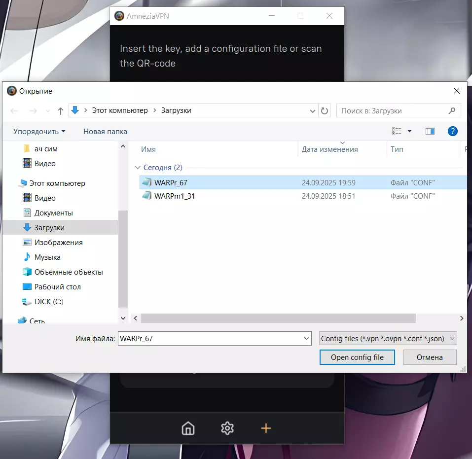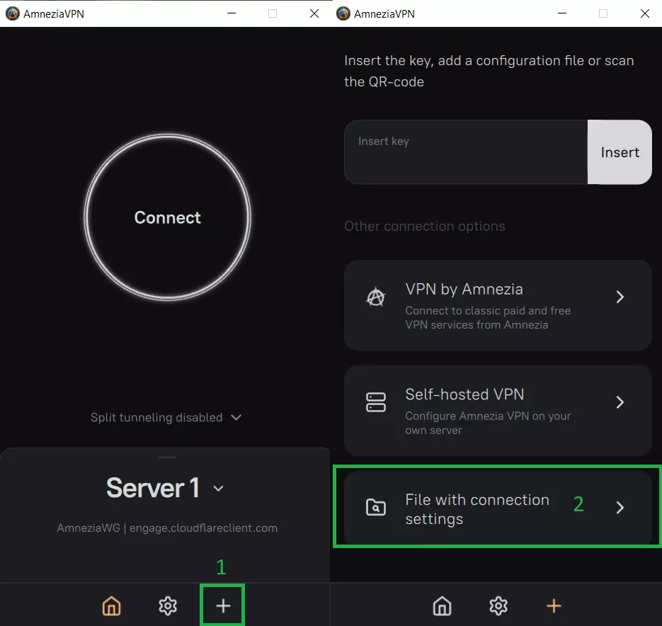 3. 设置与启动 打开Amnezia VPN → 点击加号(1)→ 添加(2)