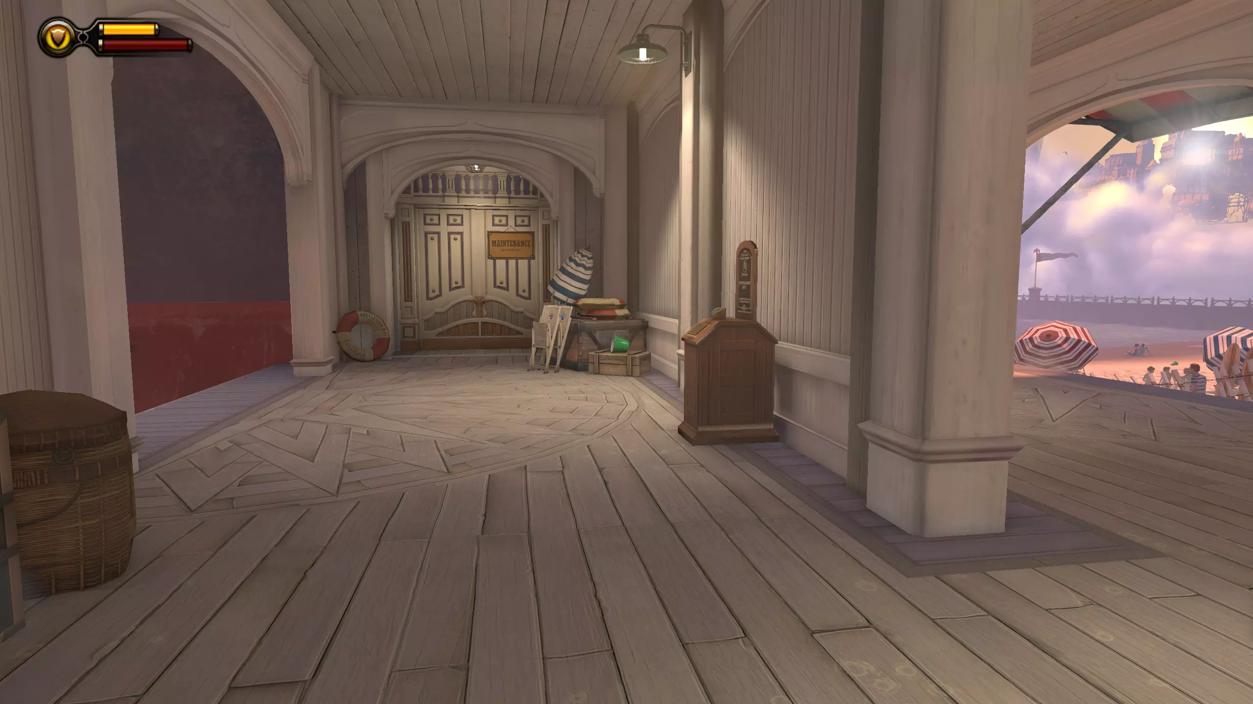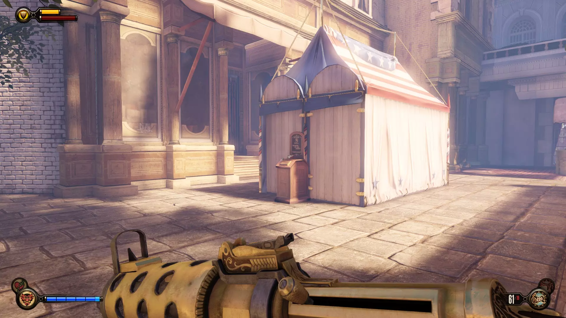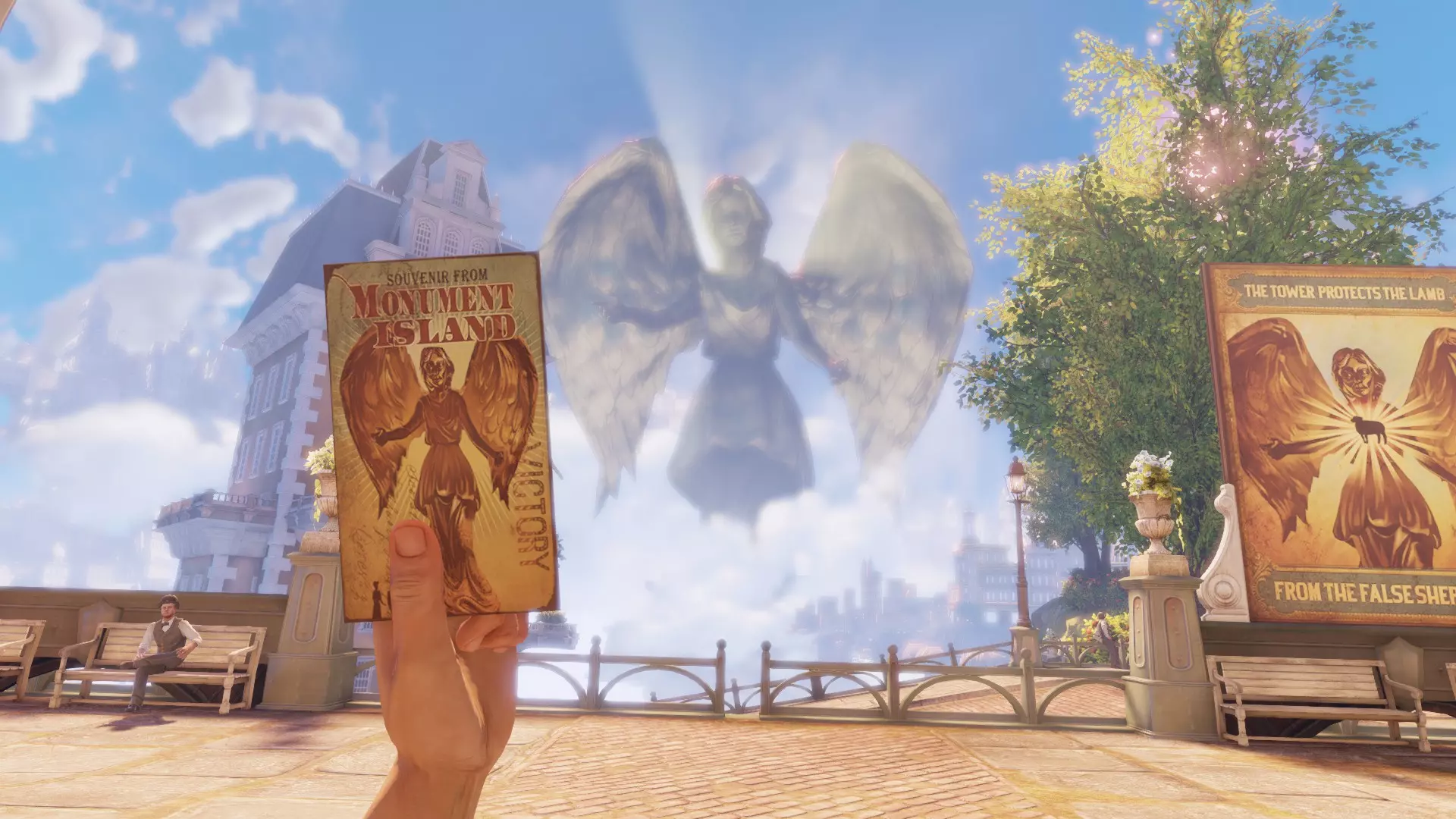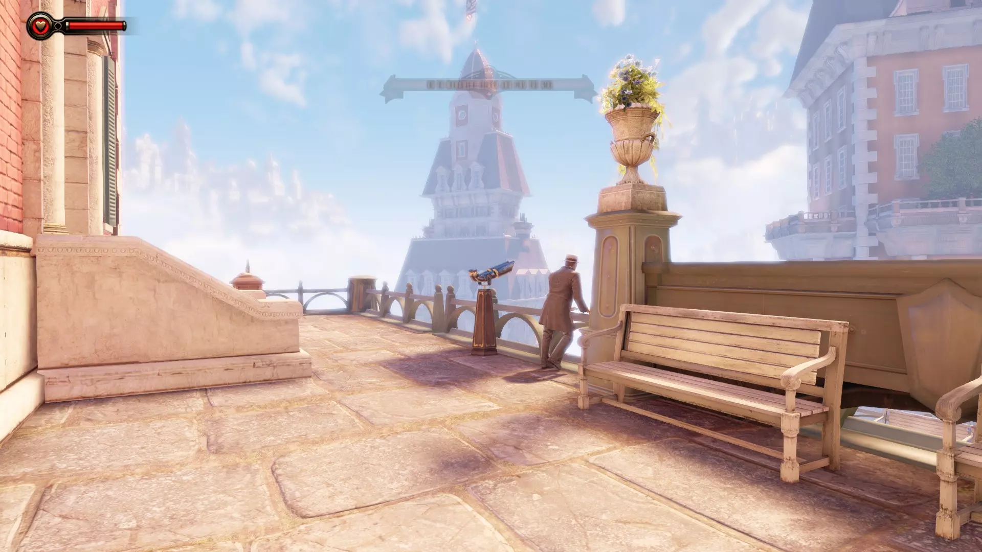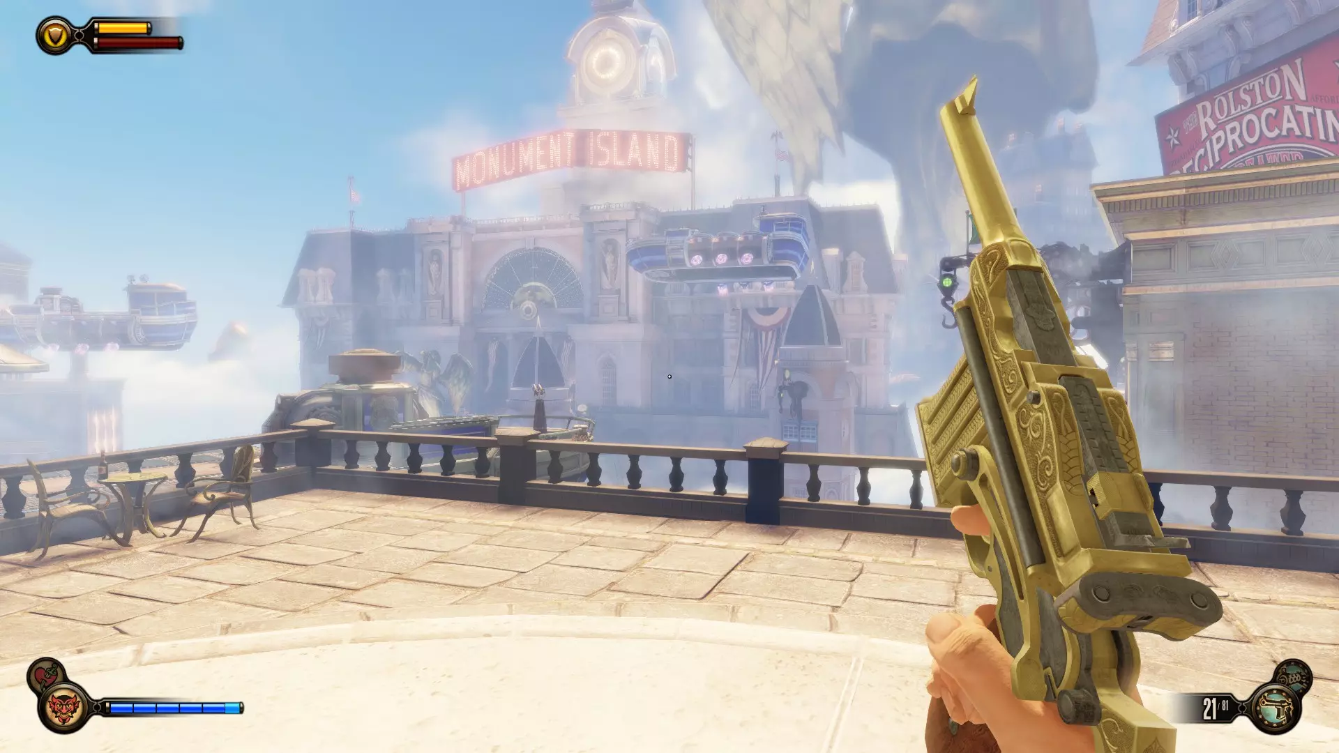 《生化奇兵:无限》 此区域位于康姆斯托克中心屋顶与纪念碑岛之间。 活动电影放映机#8 进入贡多拉建筑后右转,活动电影放映机就在远处的墙边。