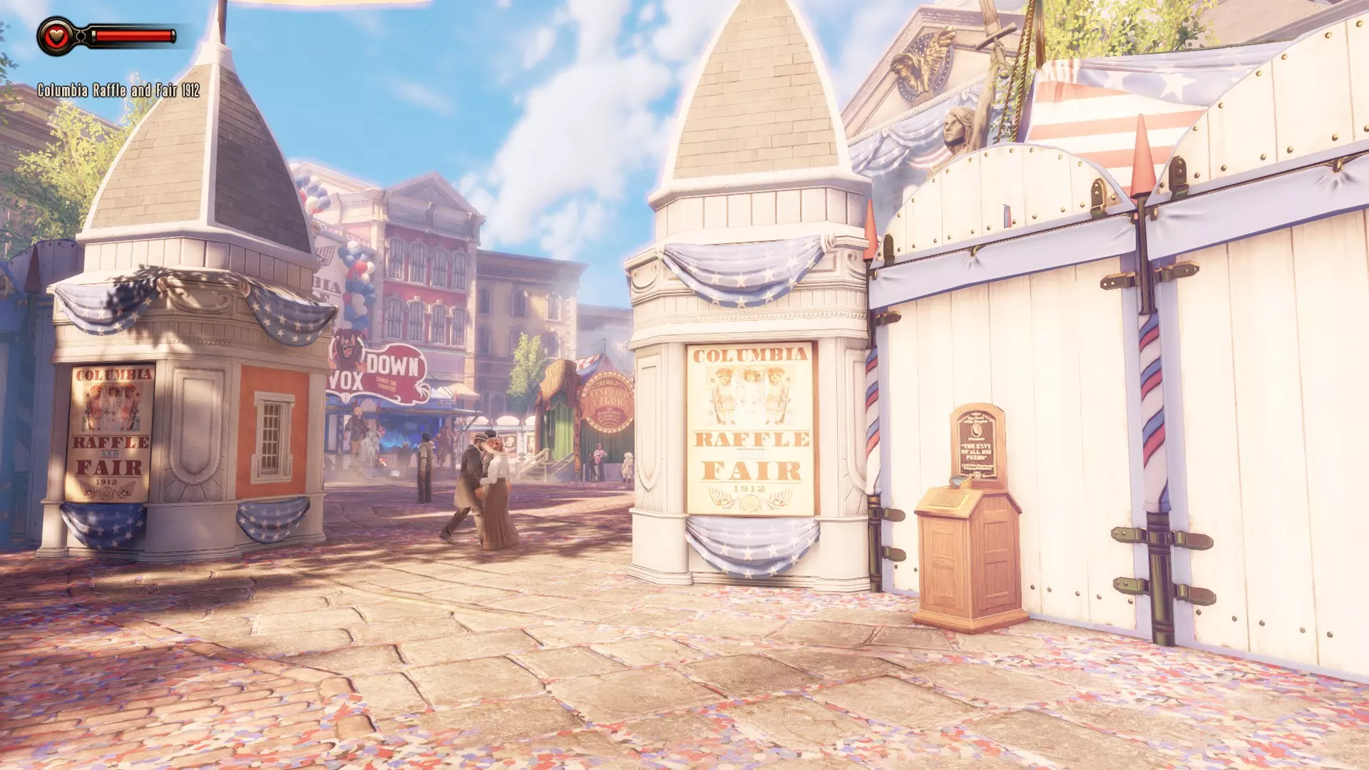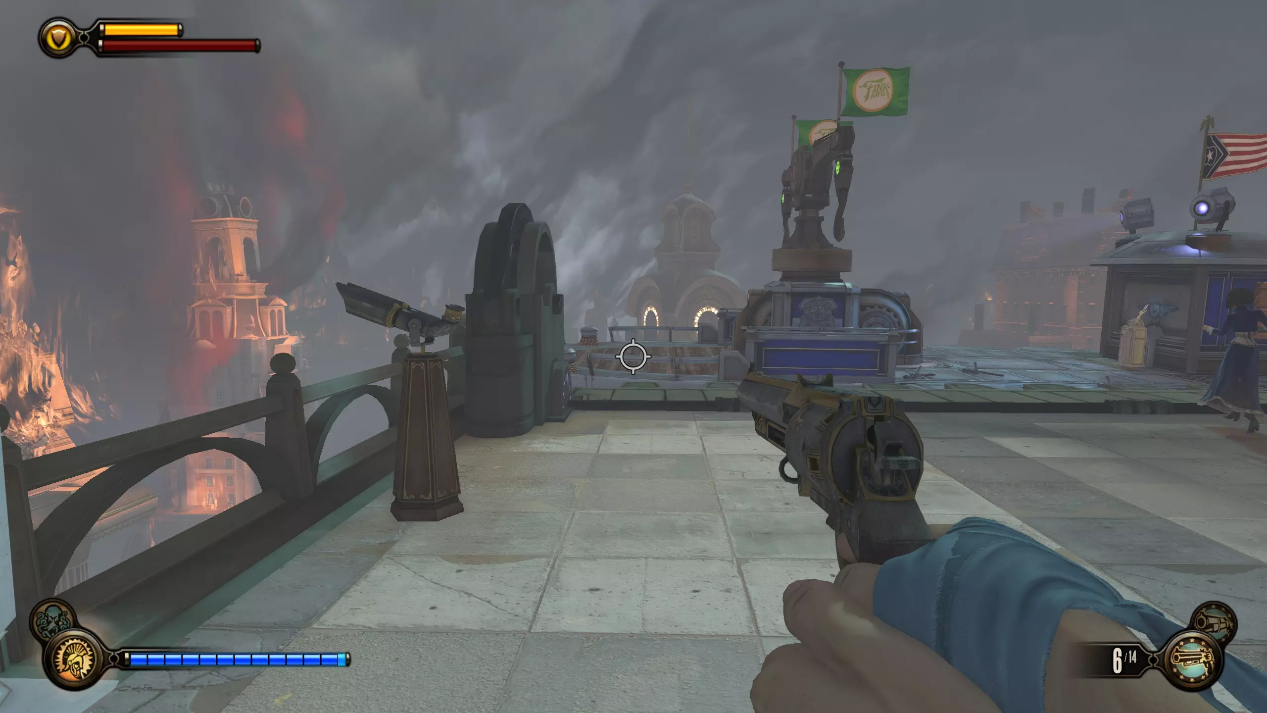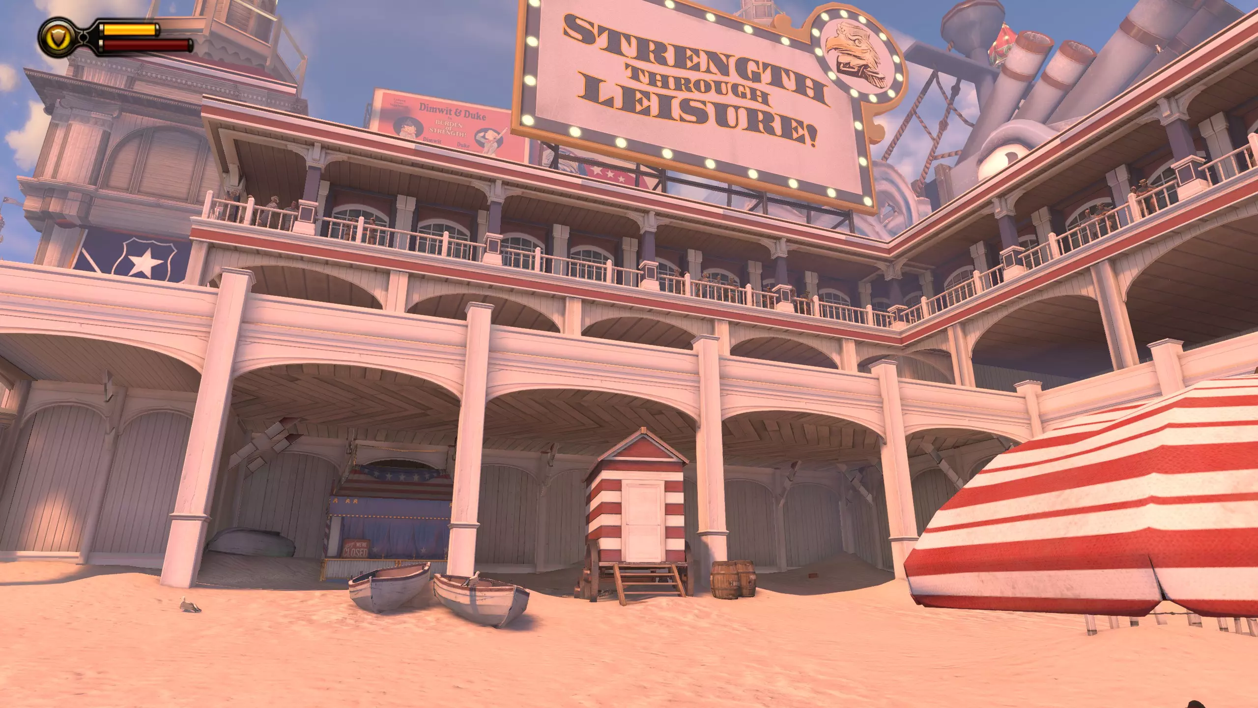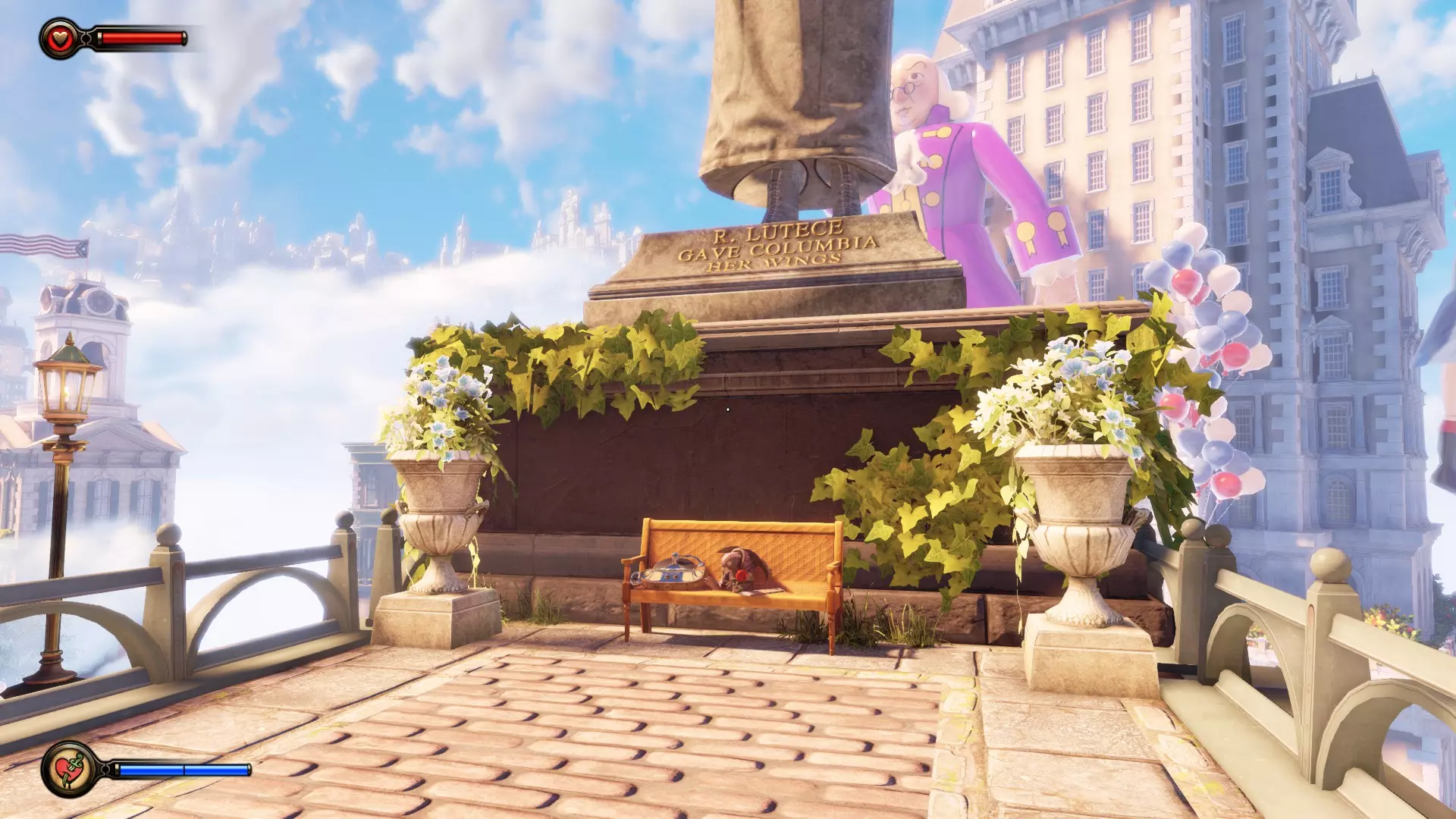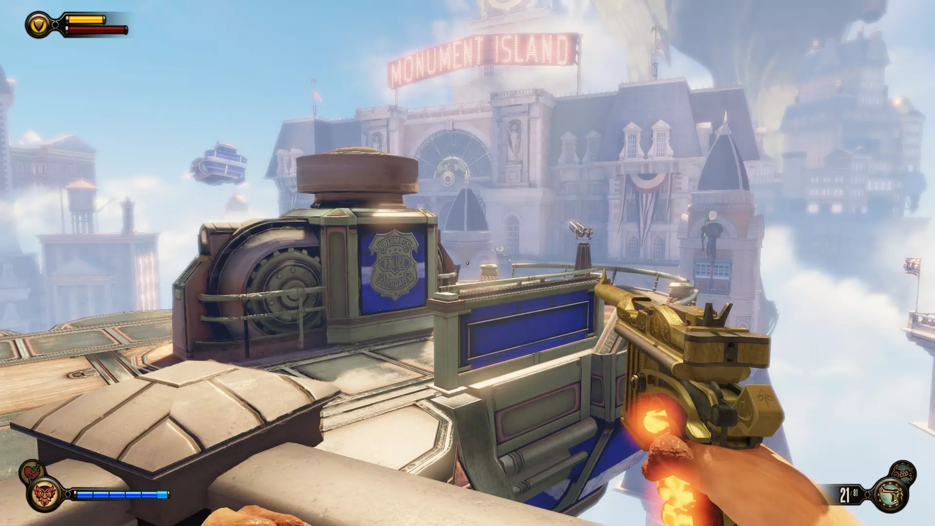 《生化奇兵:无限》 此区域位于康姆斯托克中心屋顶与纪念碑岛之间。 活动电影放映机#8 进入贡多拉建筑后右转,活动电影放映机就在远处的墙边。