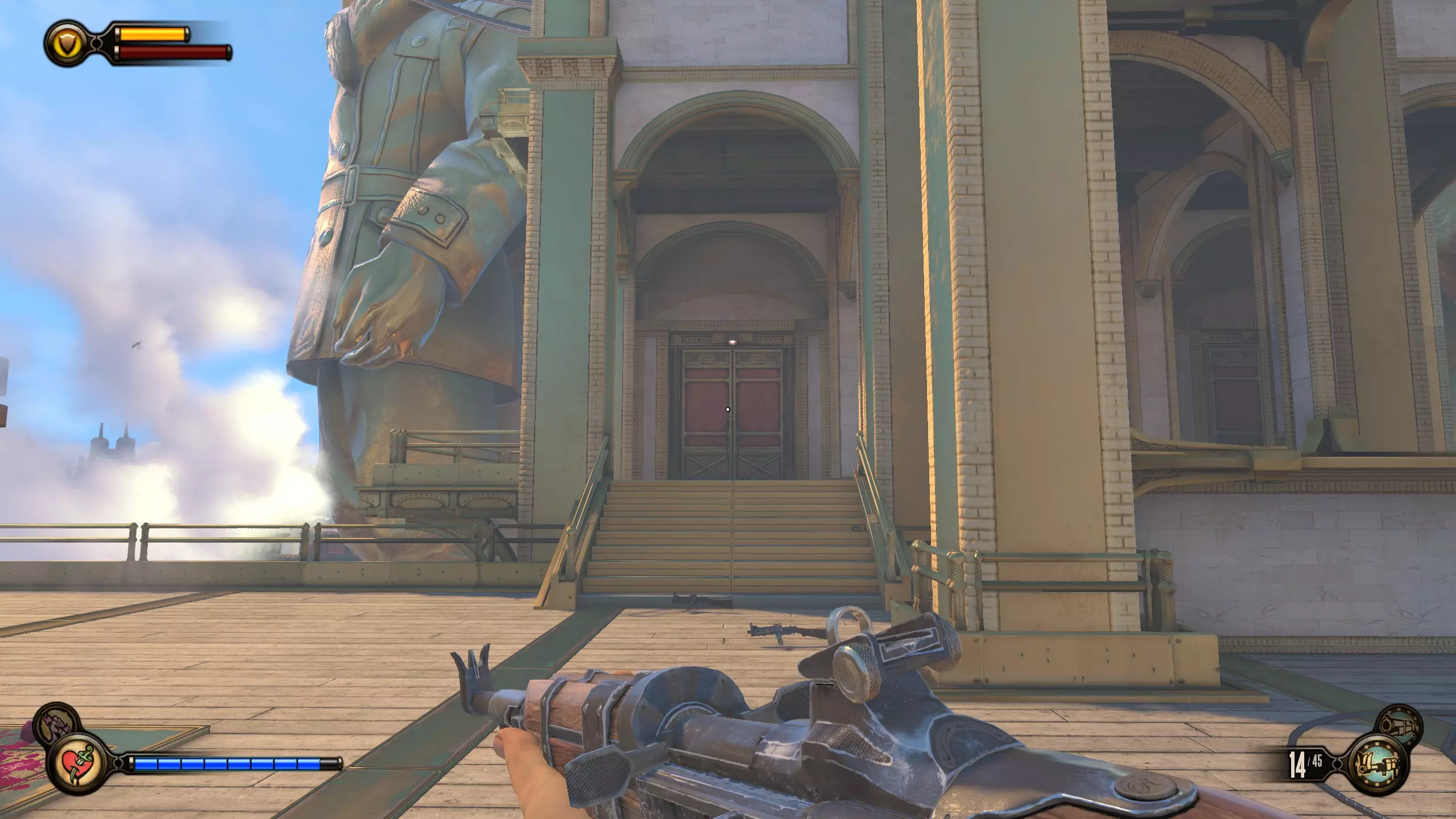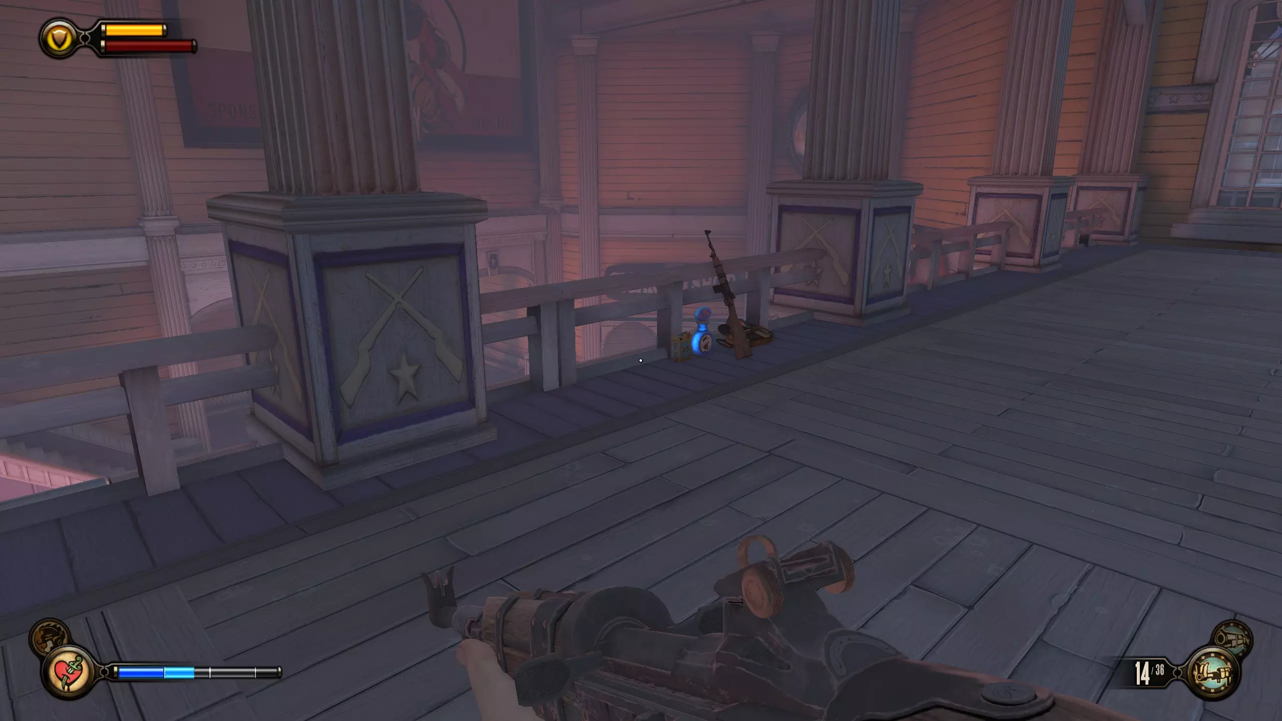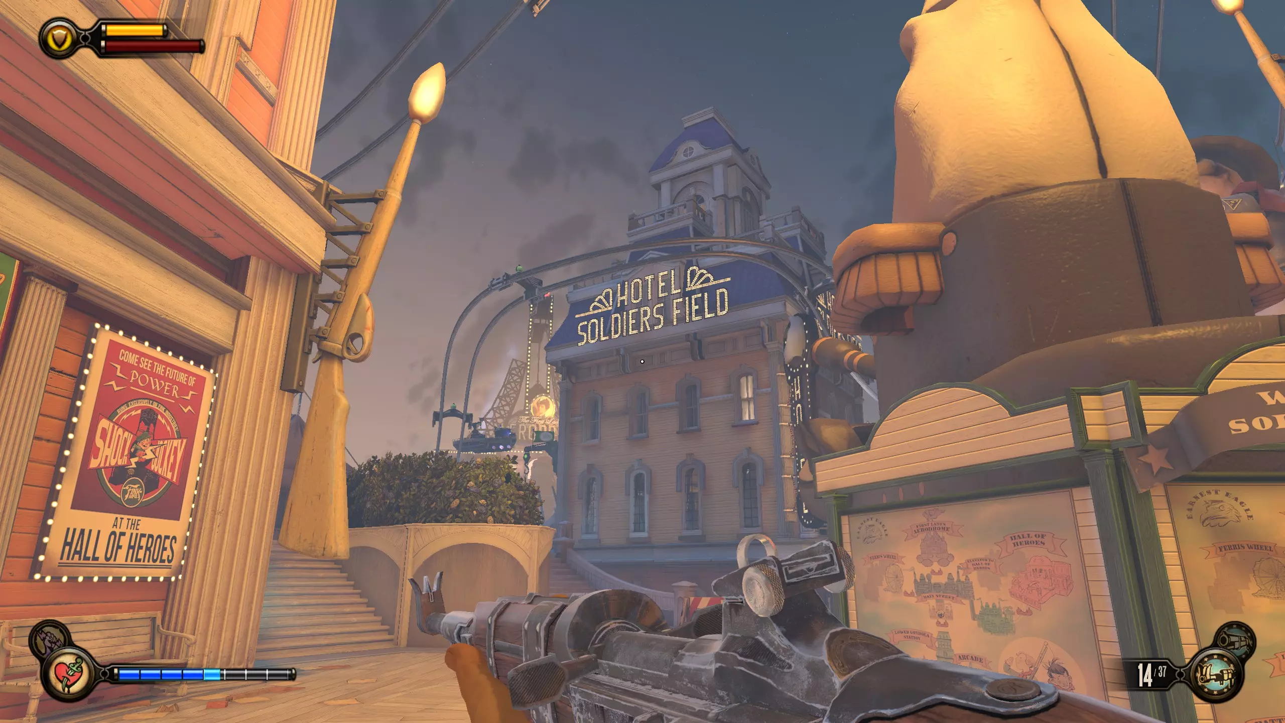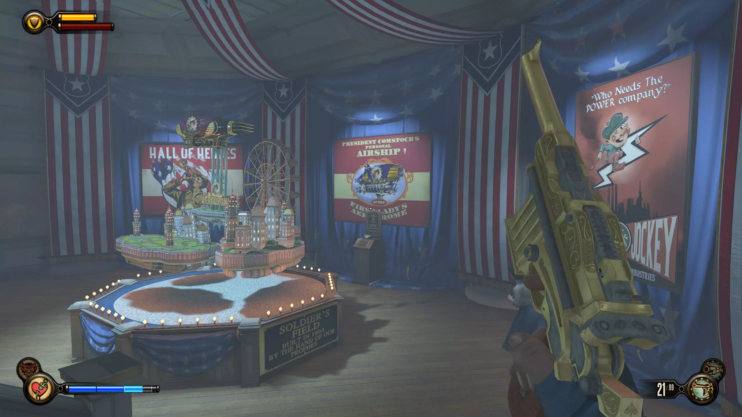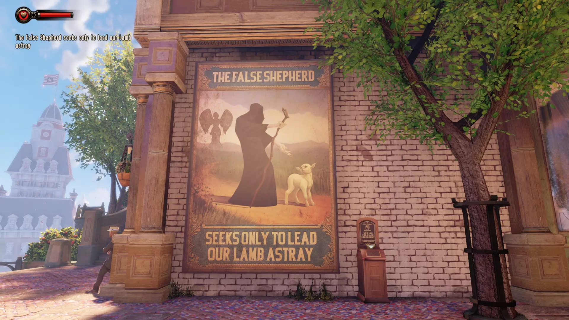 《生化奇兵:无限》 此区域位于康姆斯托克中心屋顶与纪念碑岛之间。 活动电影放映机#8 进入贡多拉建筑后右转,活动电影放映机就在远处的墙边。