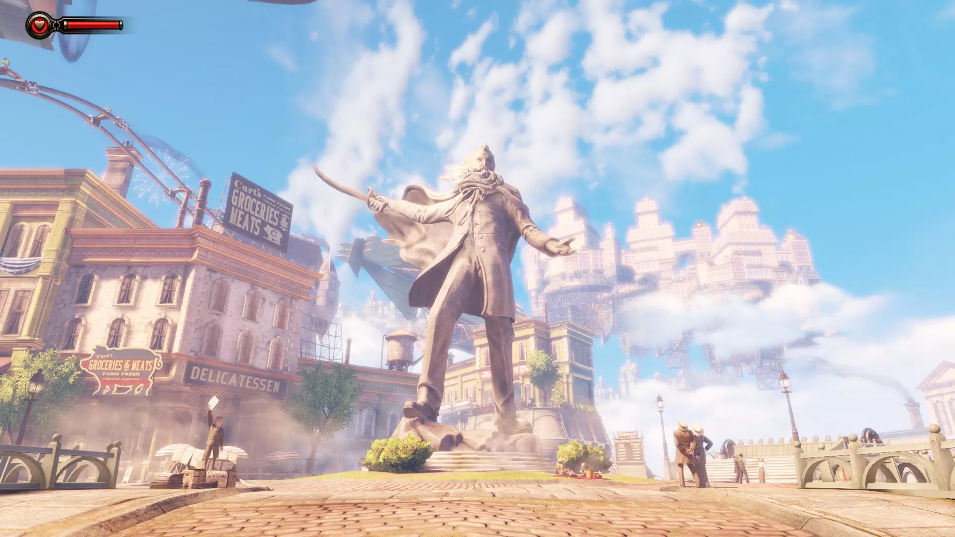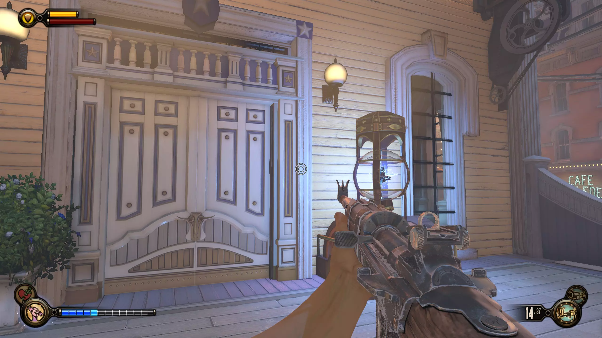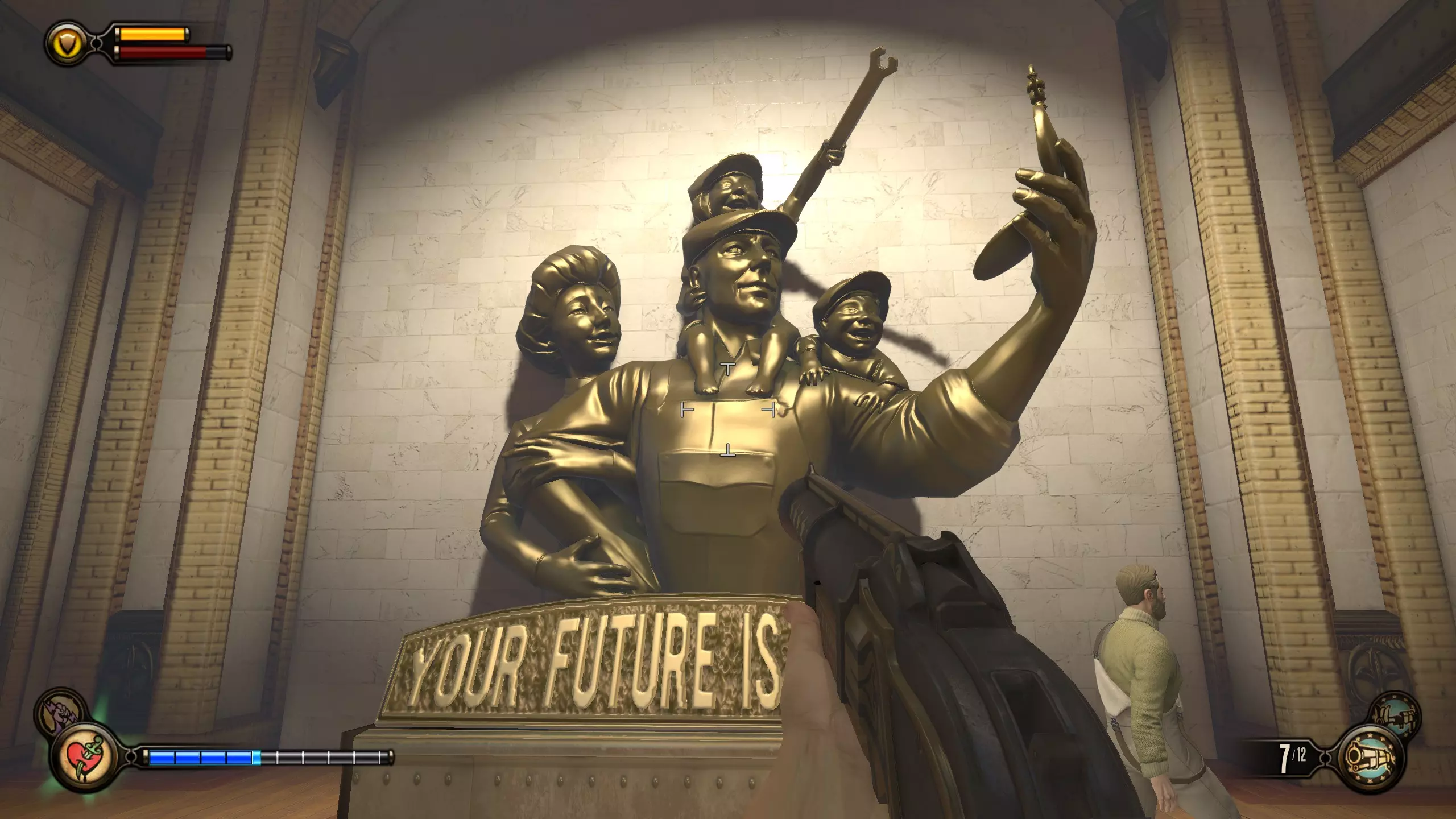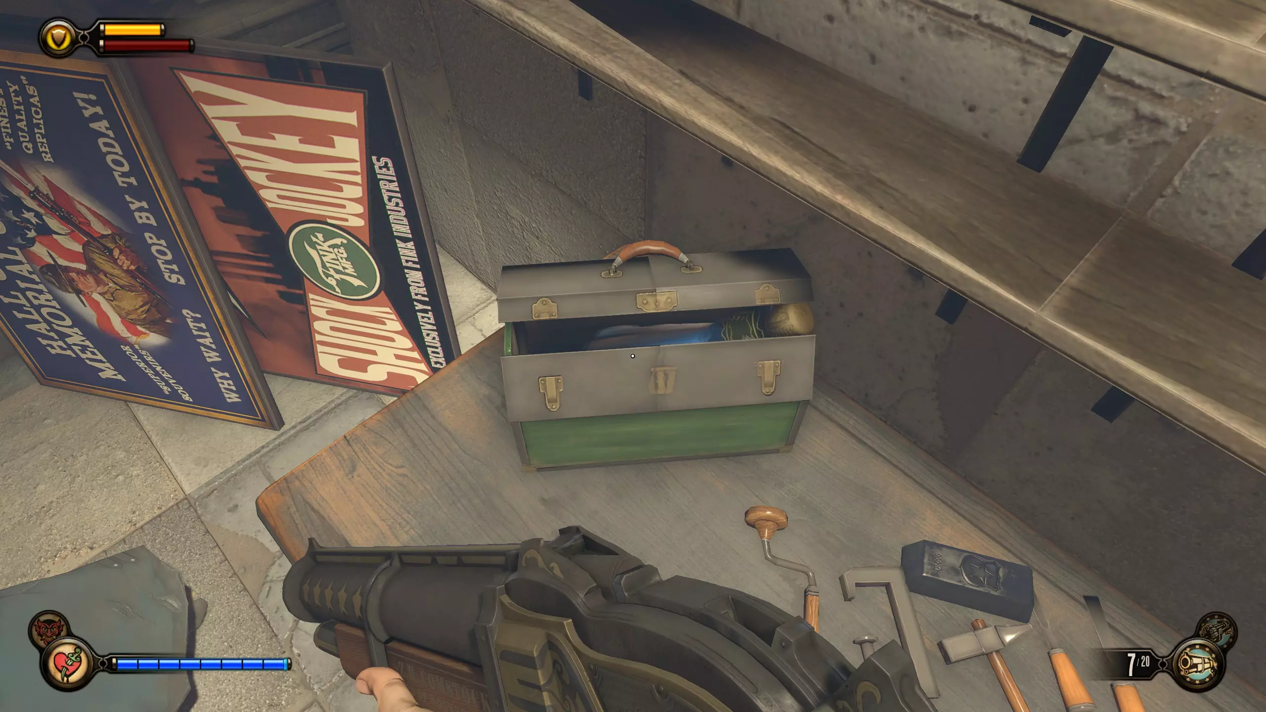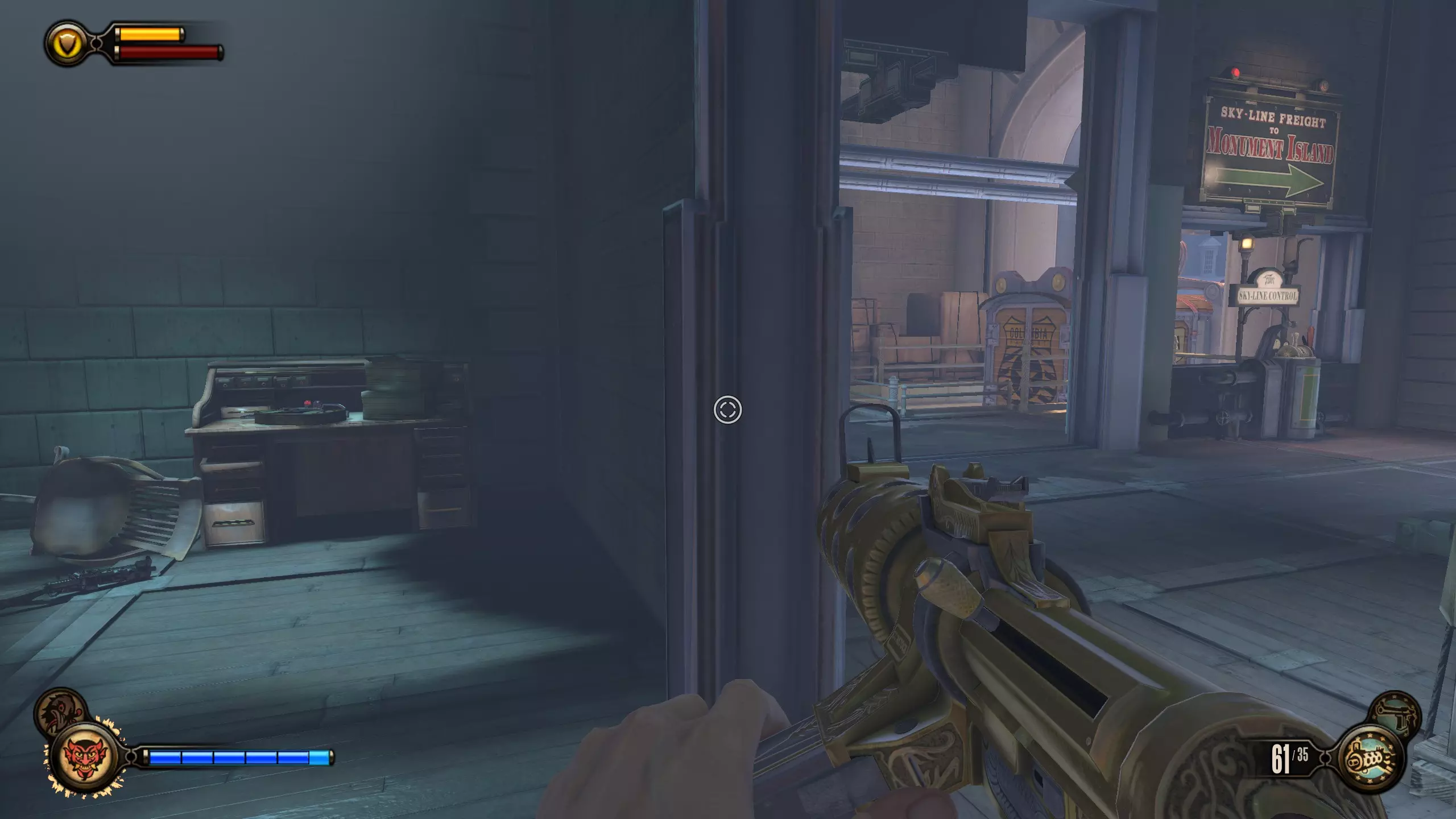 《生化奇兵:无限》 此区域位于康姆斯托克中心屋顶与纪念碑岛之间。 活动电影放映机#8 进入贡多拉建筑后右转,活动电影放映机就在远处的墙边。