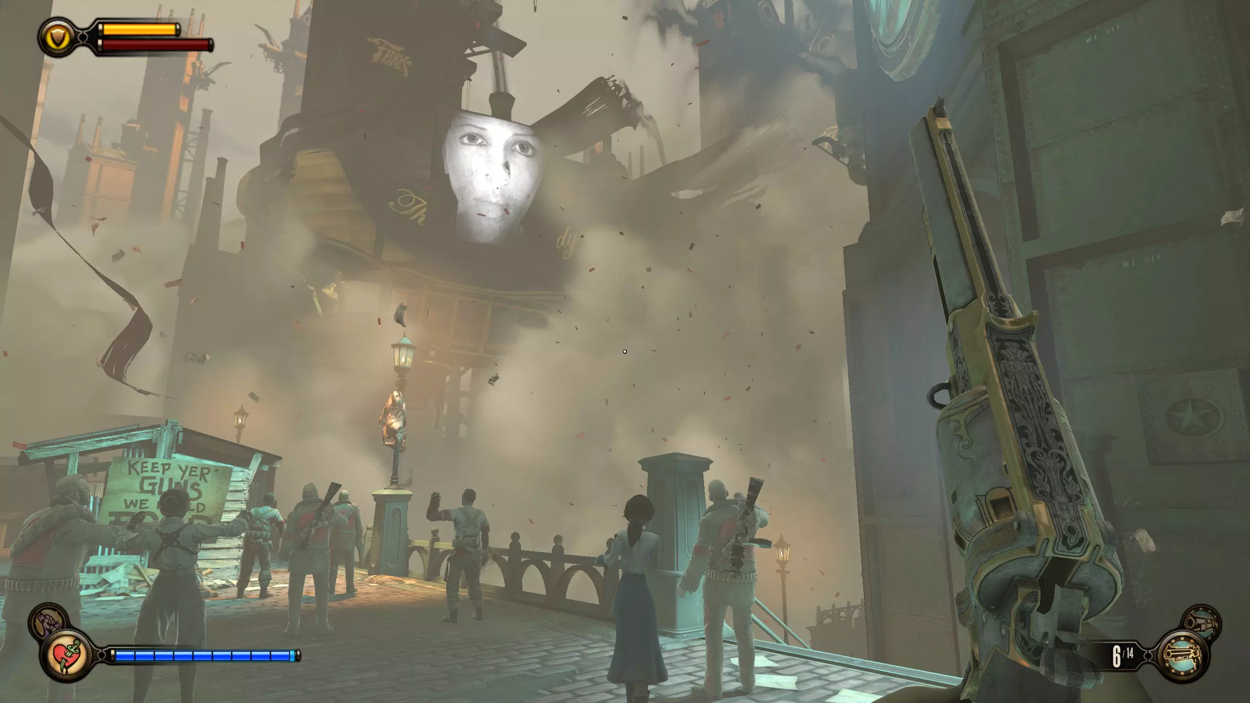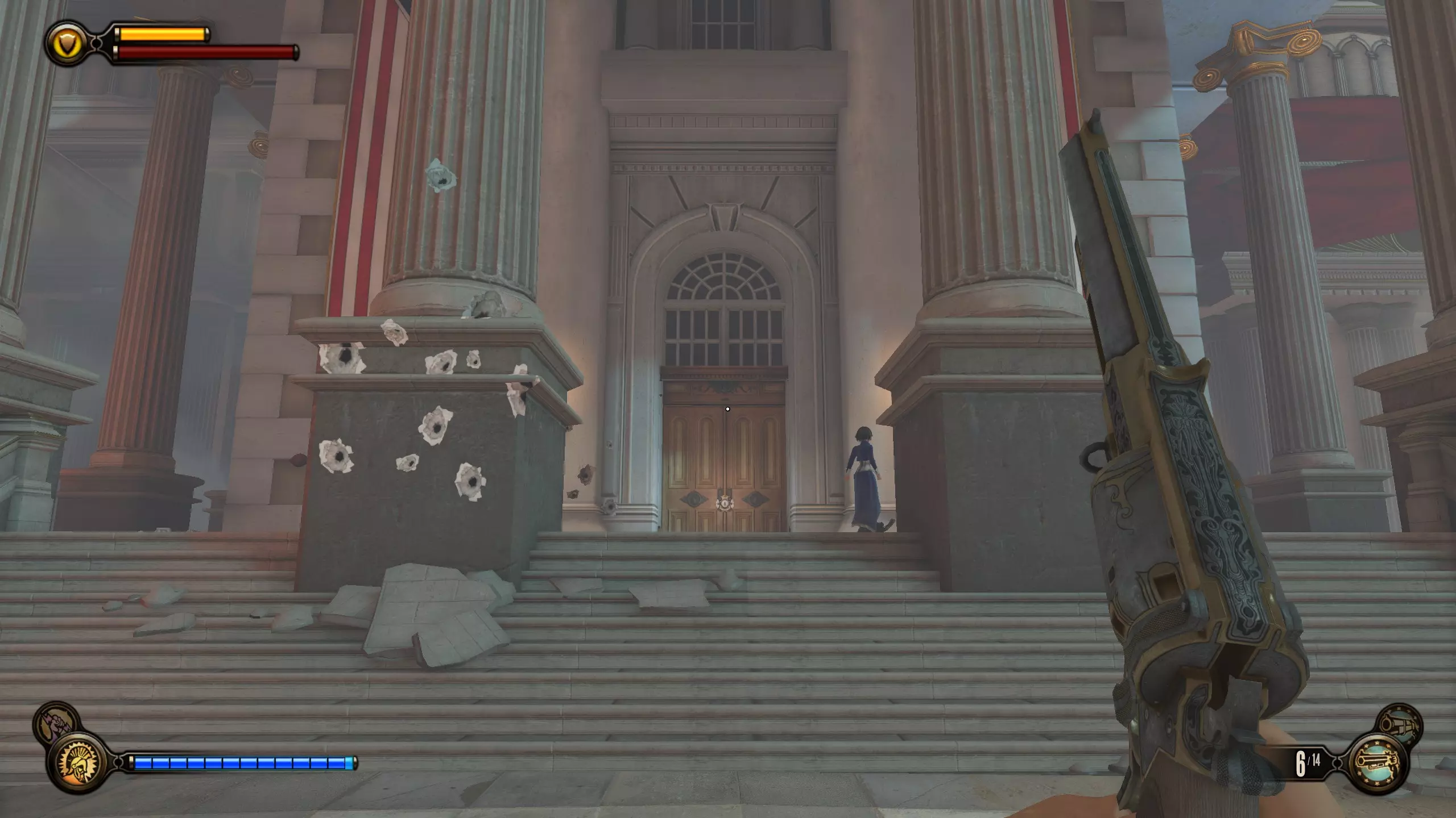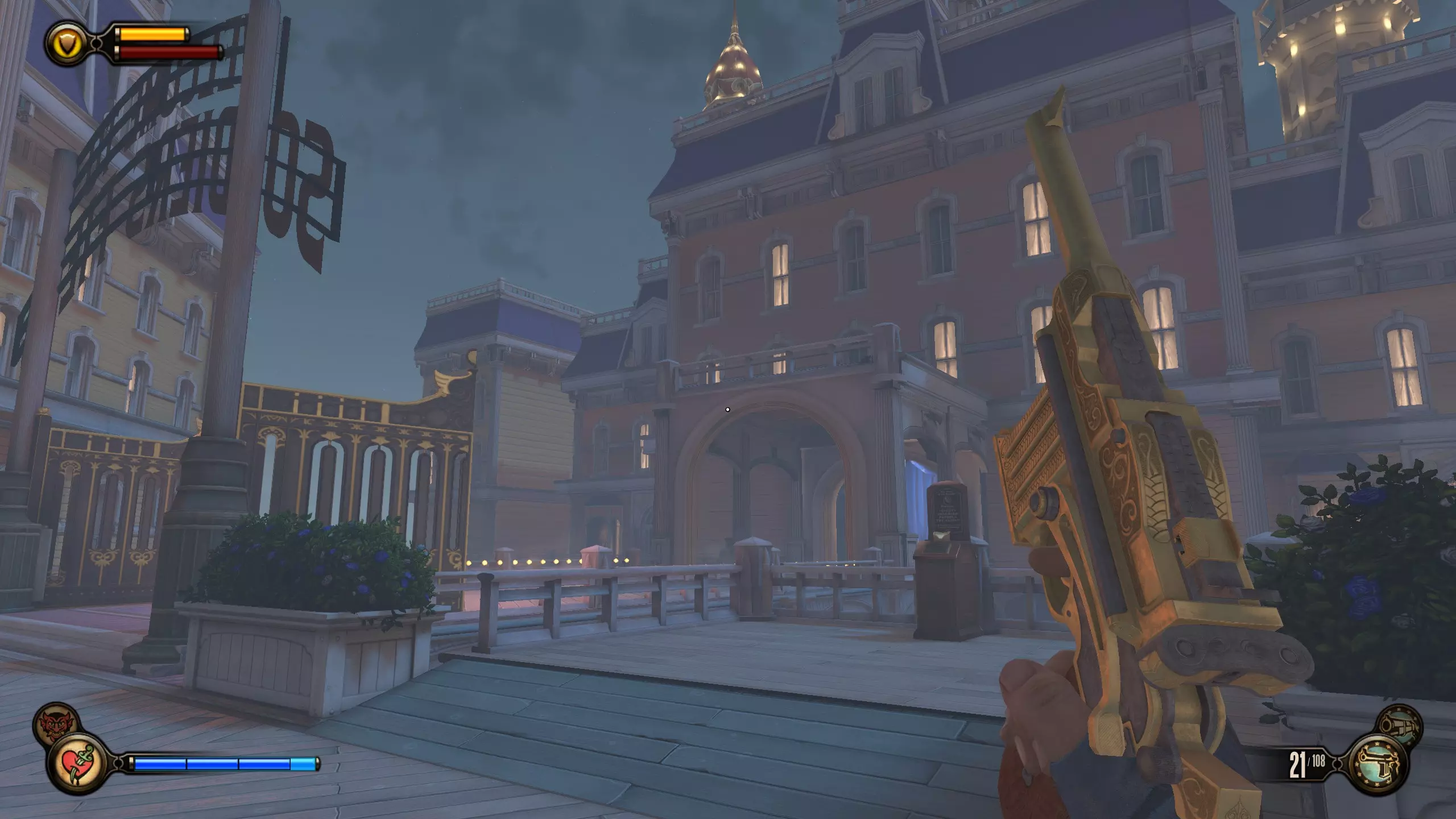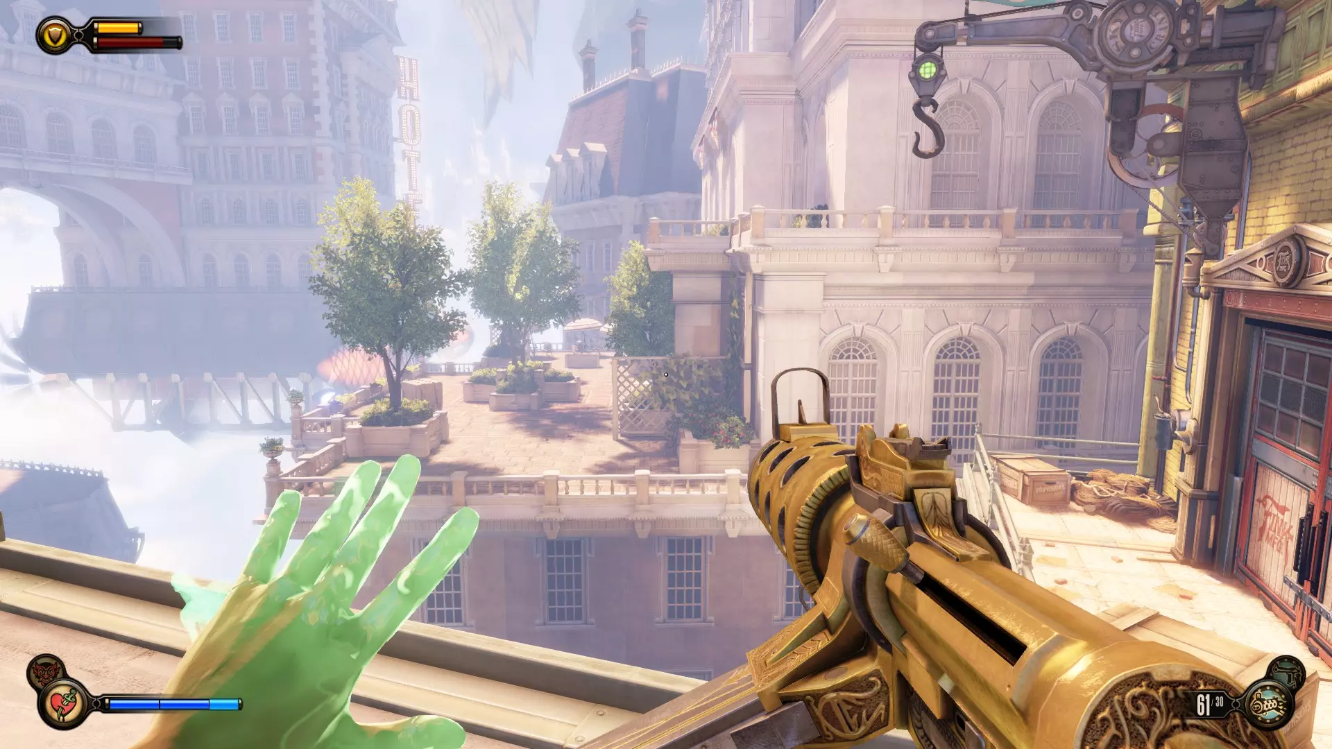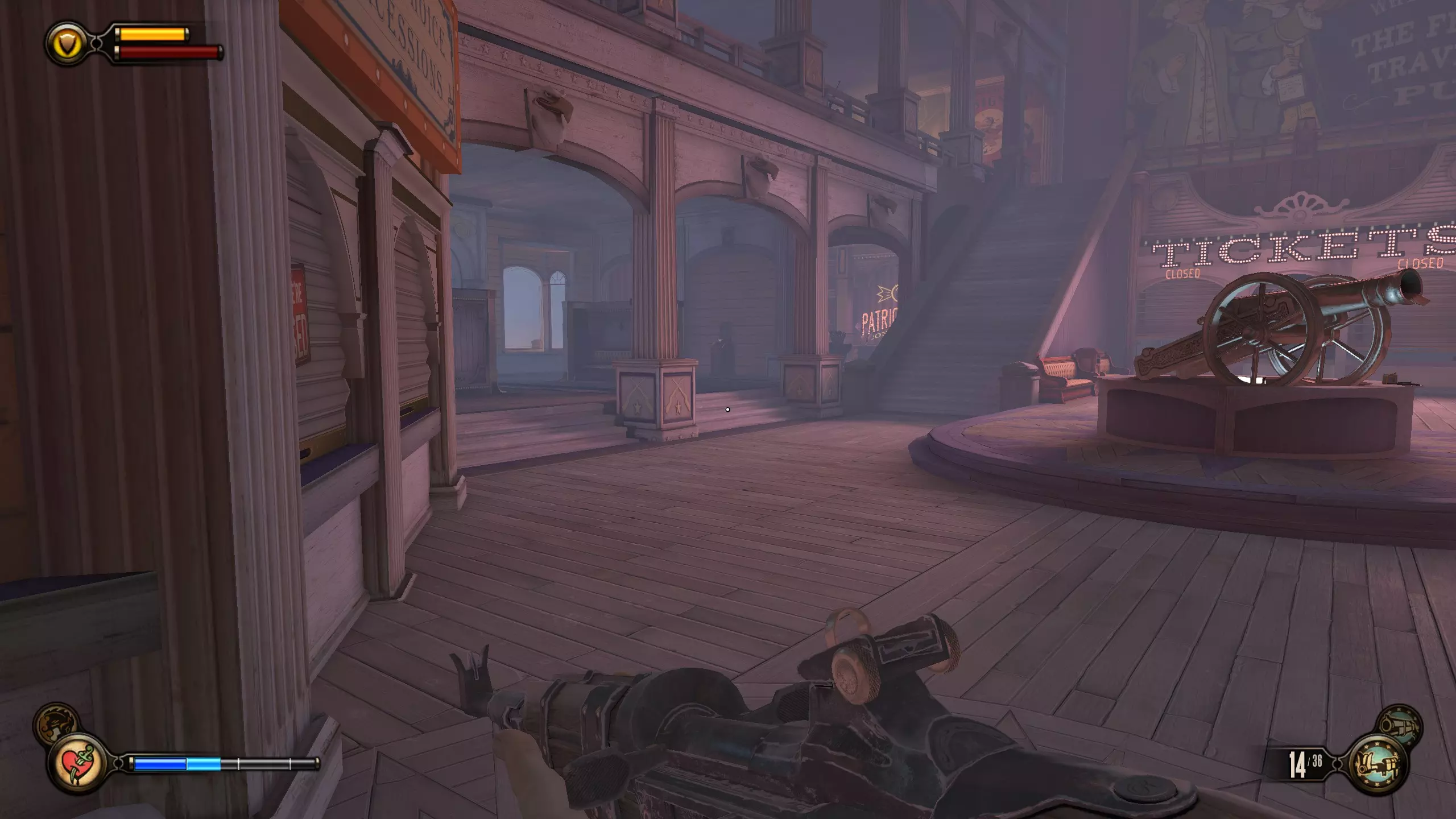 《生化奇兵:无限》 此区域位于康姆斯托克中心屋顶与纪念碑岛之间。 活动电影放映机#8 进入贡多拉建筑后右转,活动电影放映机就在远处的墙边。