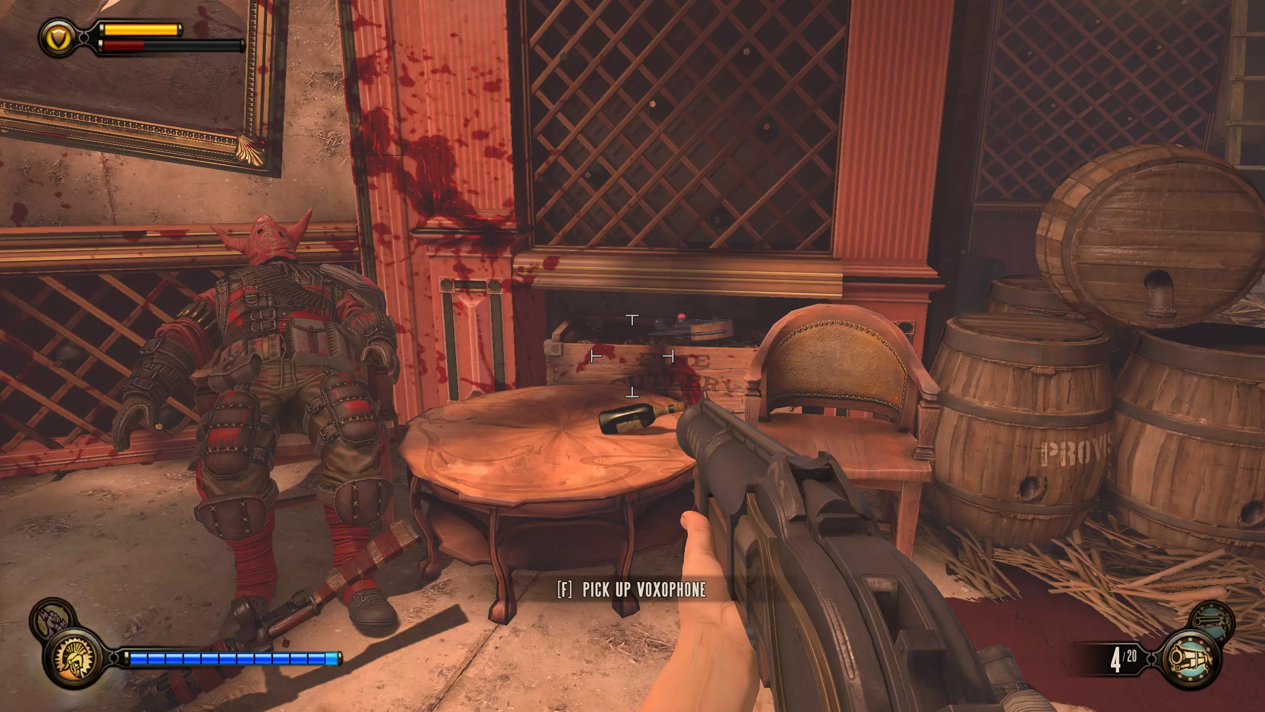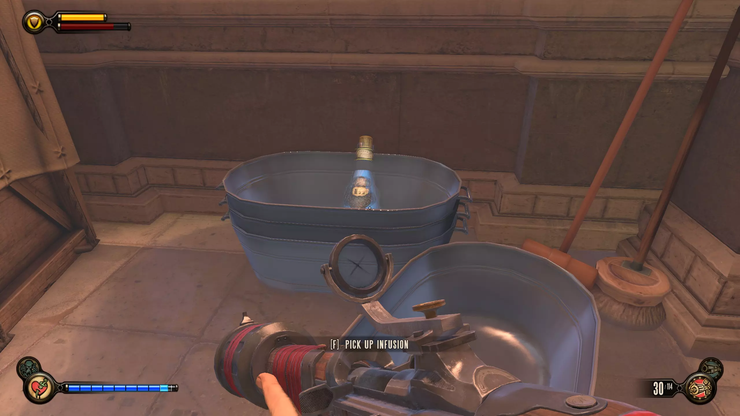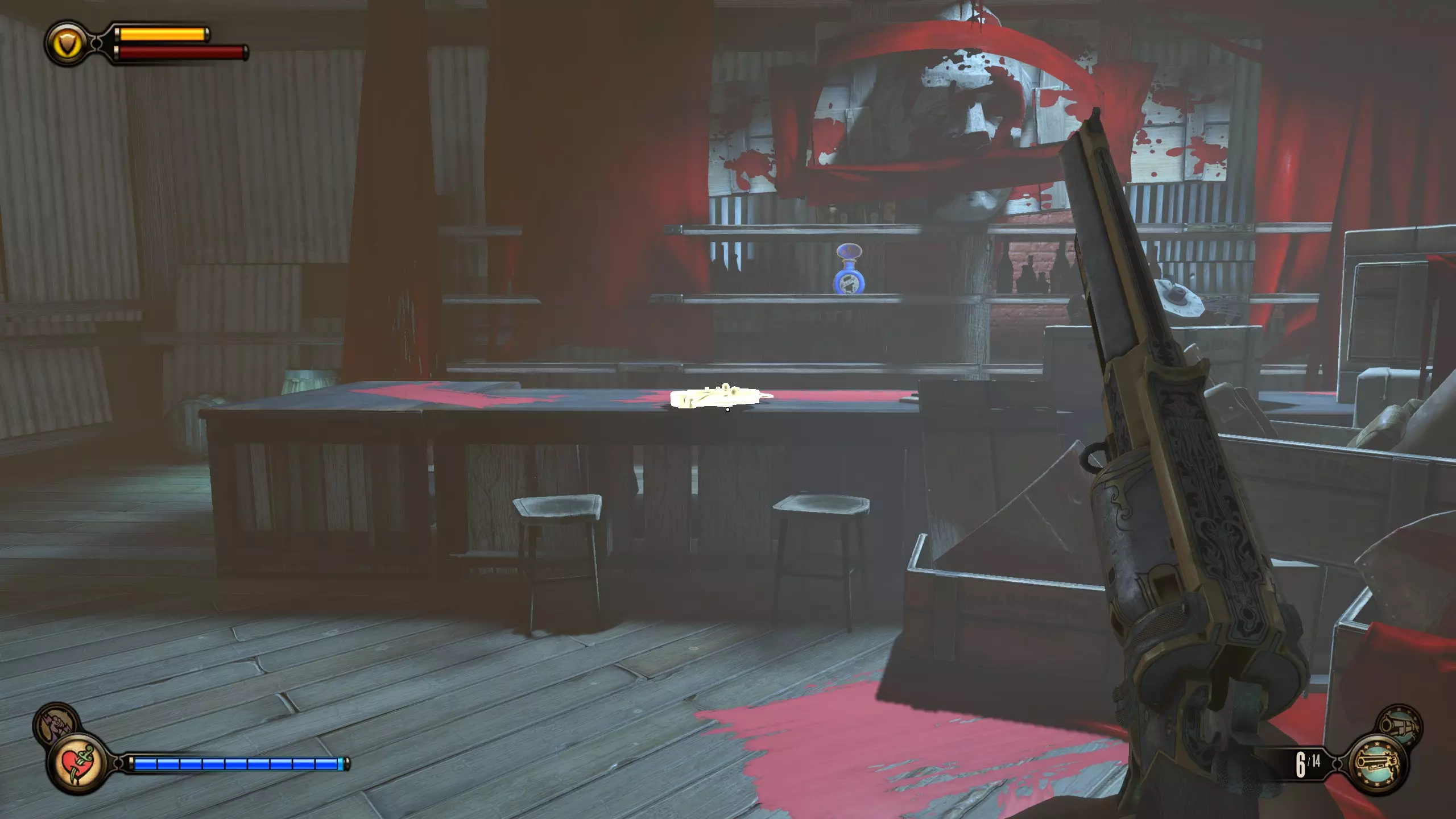 留声机#57和灌注#20 现在一路返回咸牡蛎酒吧。会有更多敌人刷新。到达酒吧后,走到吧台后面,按下收银机下方的按钮。解锁区域内的柜台上有一个灌注,左侧的金属桶里有留声机。