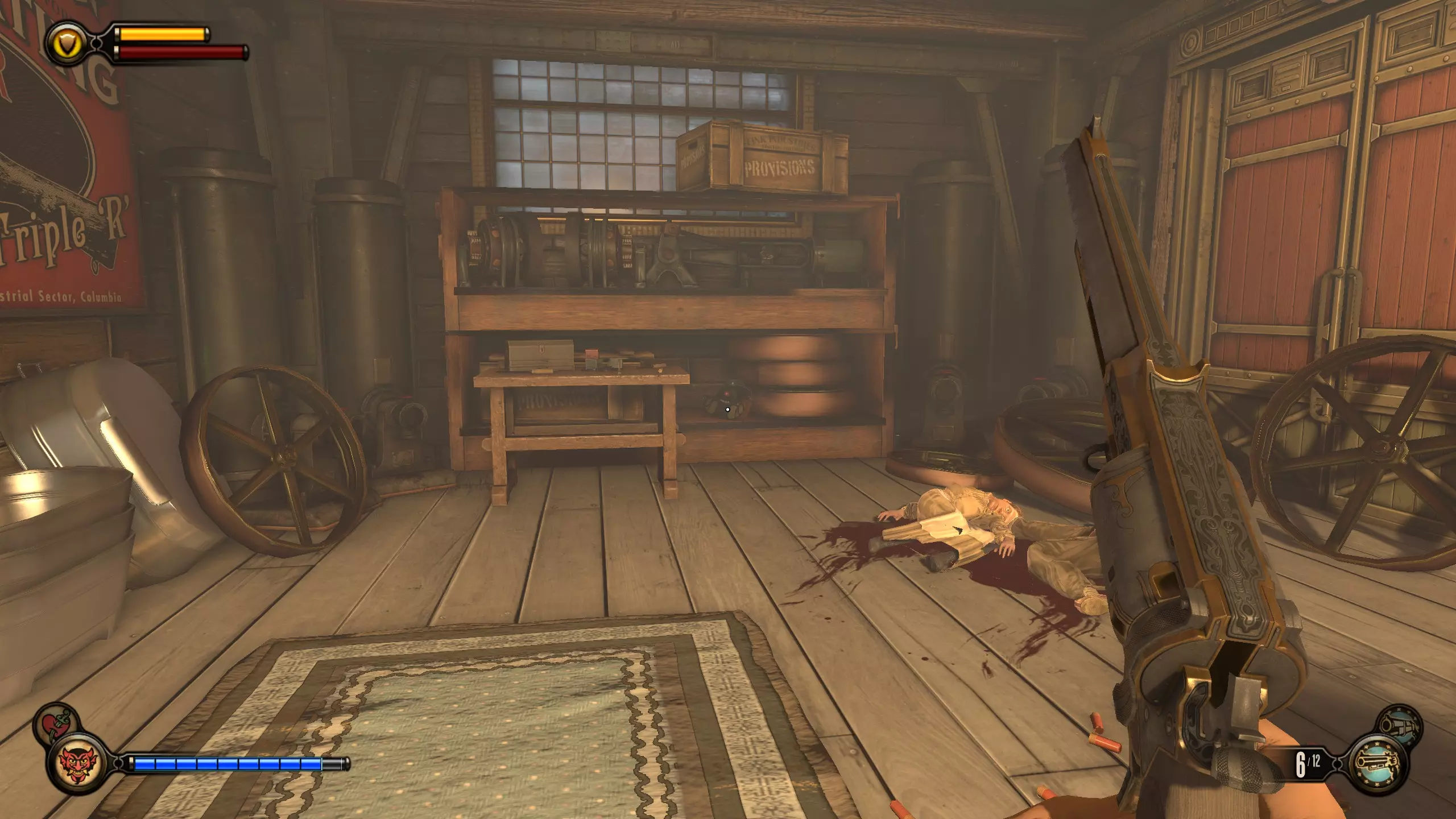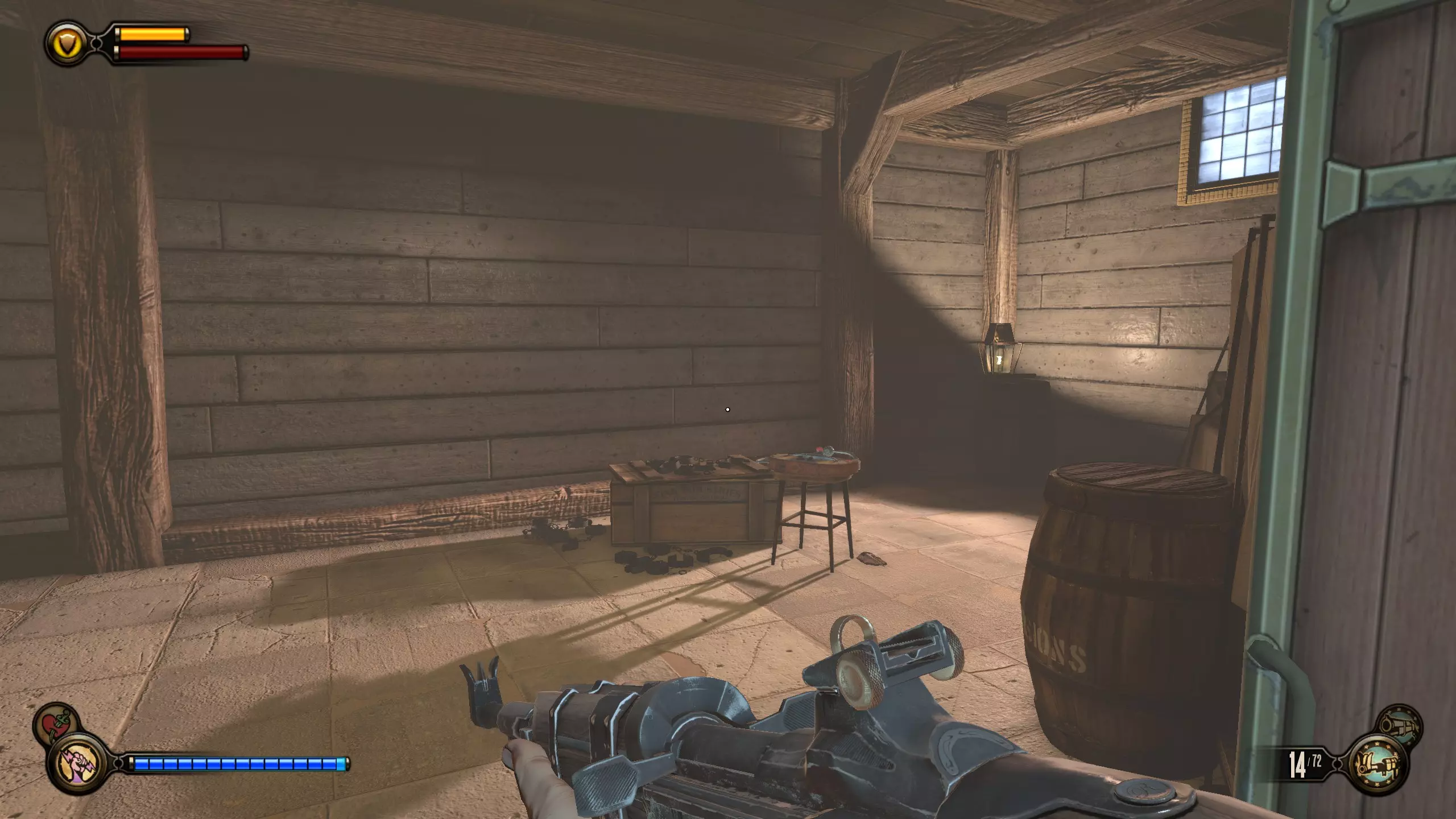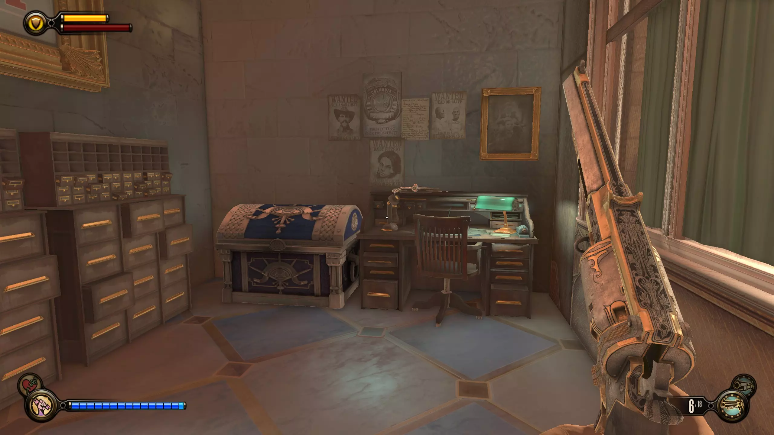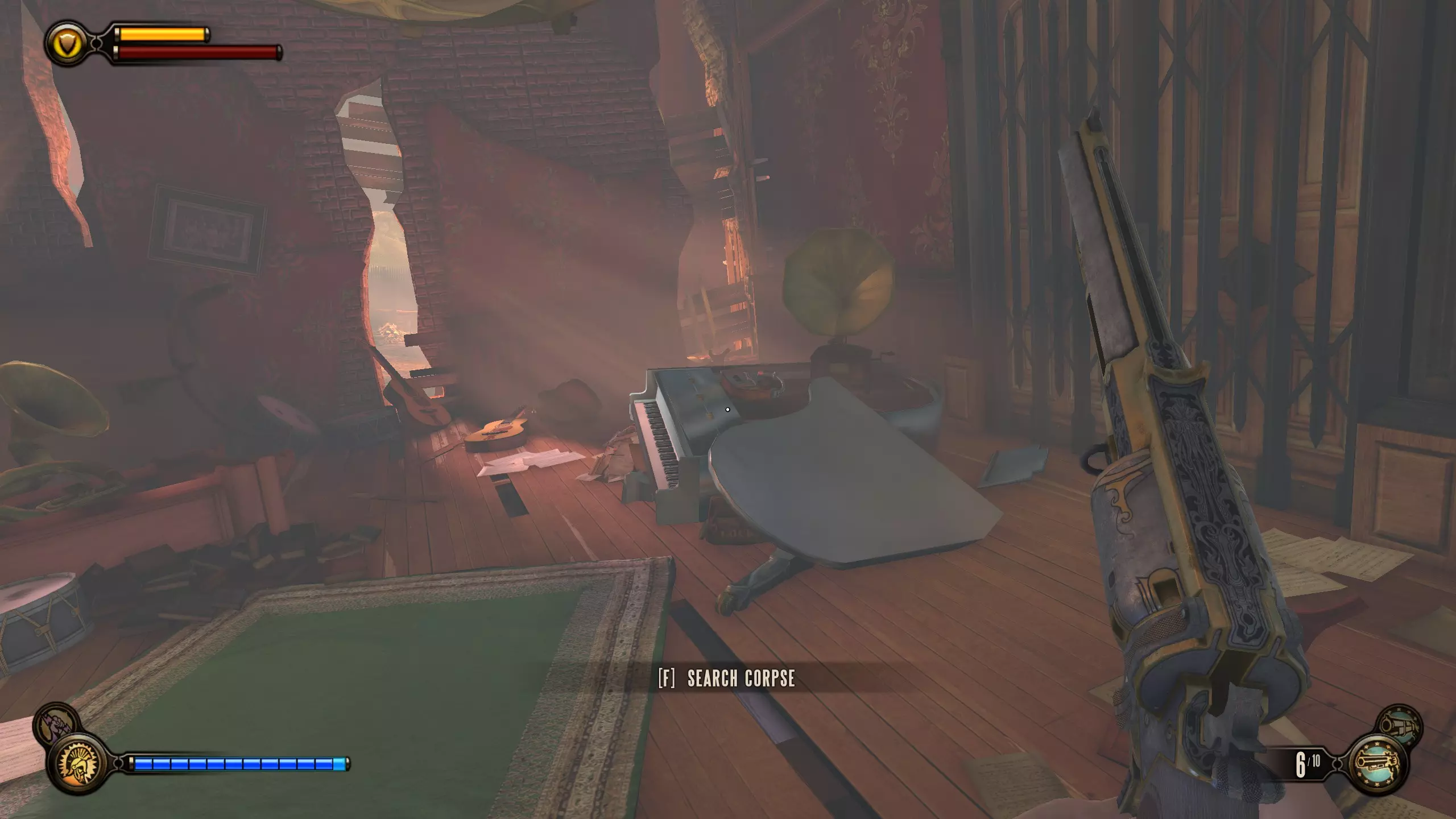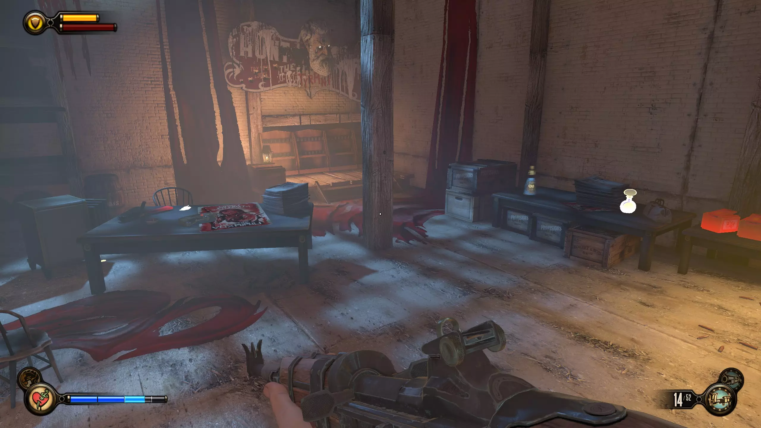 留声机32号和灌注9号:击败一群斯莱特的手下后,会出现一个斯莱特打开后敌人涌出的房间。该房间位于斯莱特出现在阳台上的位置左侧。进入房间,桌子上有一台留声机。然后跳上桌子,工具箱里有一个灌注。