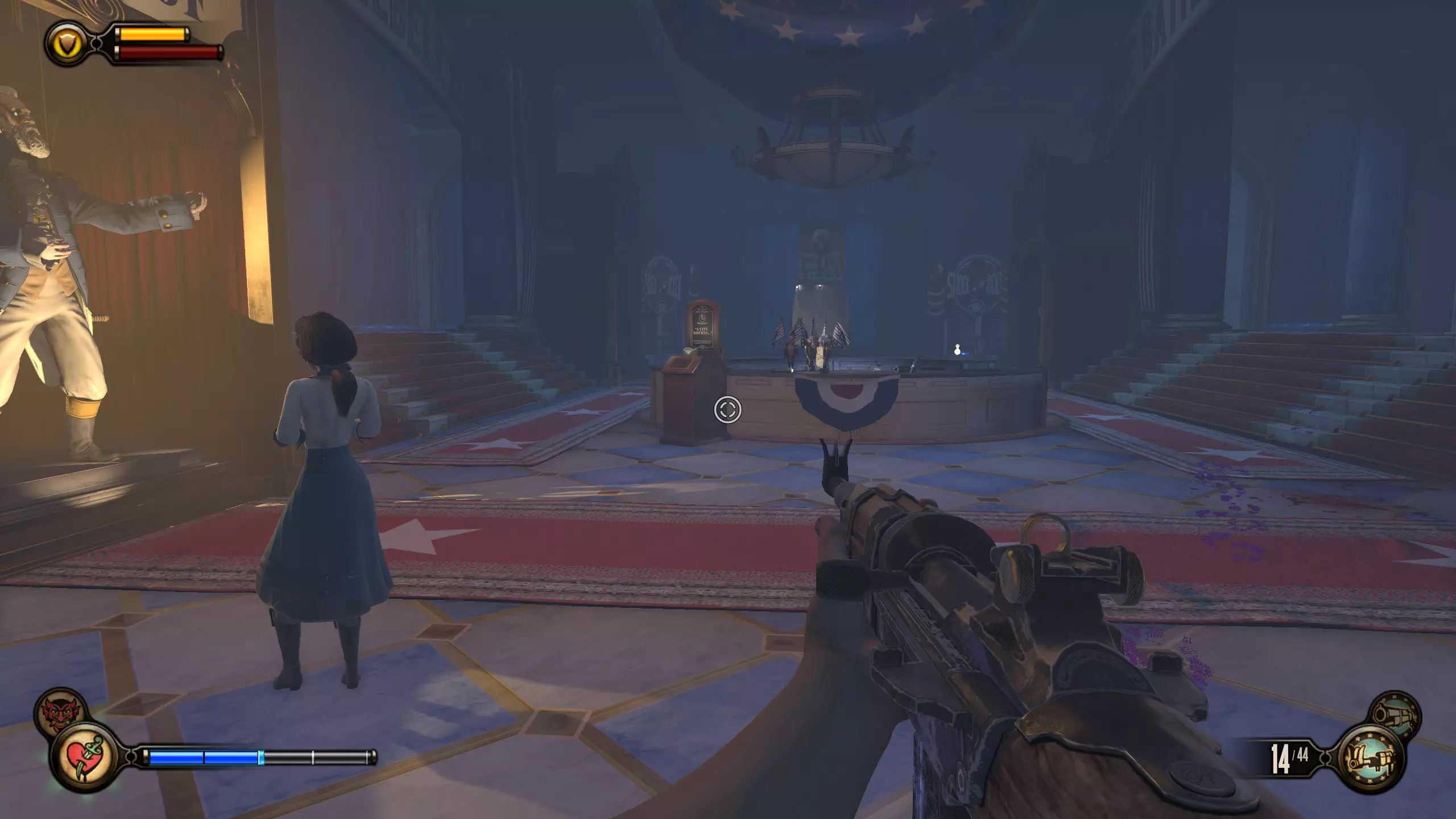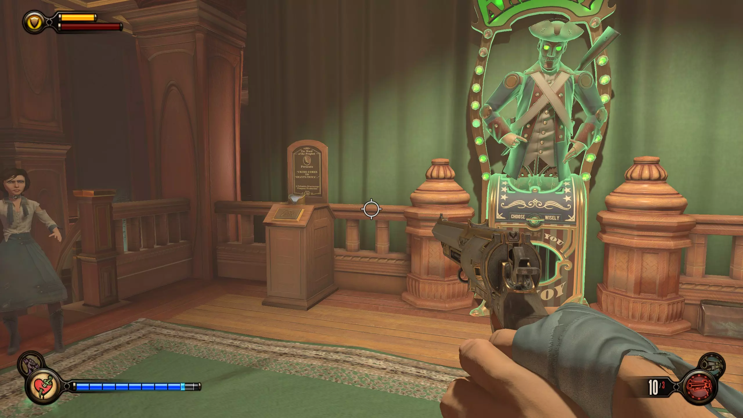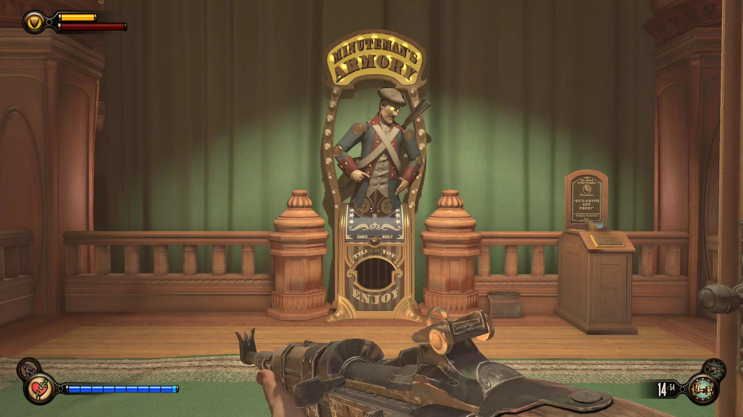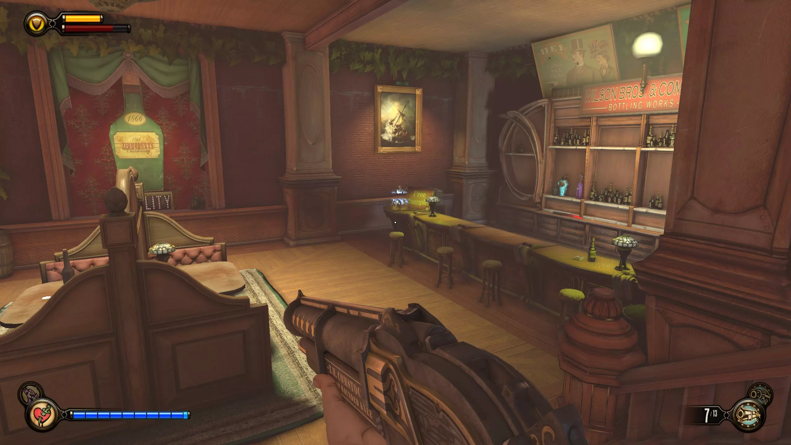 康姆斯托克中心屋顶 活动电影放映机4-6号和灌注1号 走进蓝带酒吧后,你面前会有三台活动电影放映机。与卢特斯双胞胎交谈可获得你的第一个灌注。